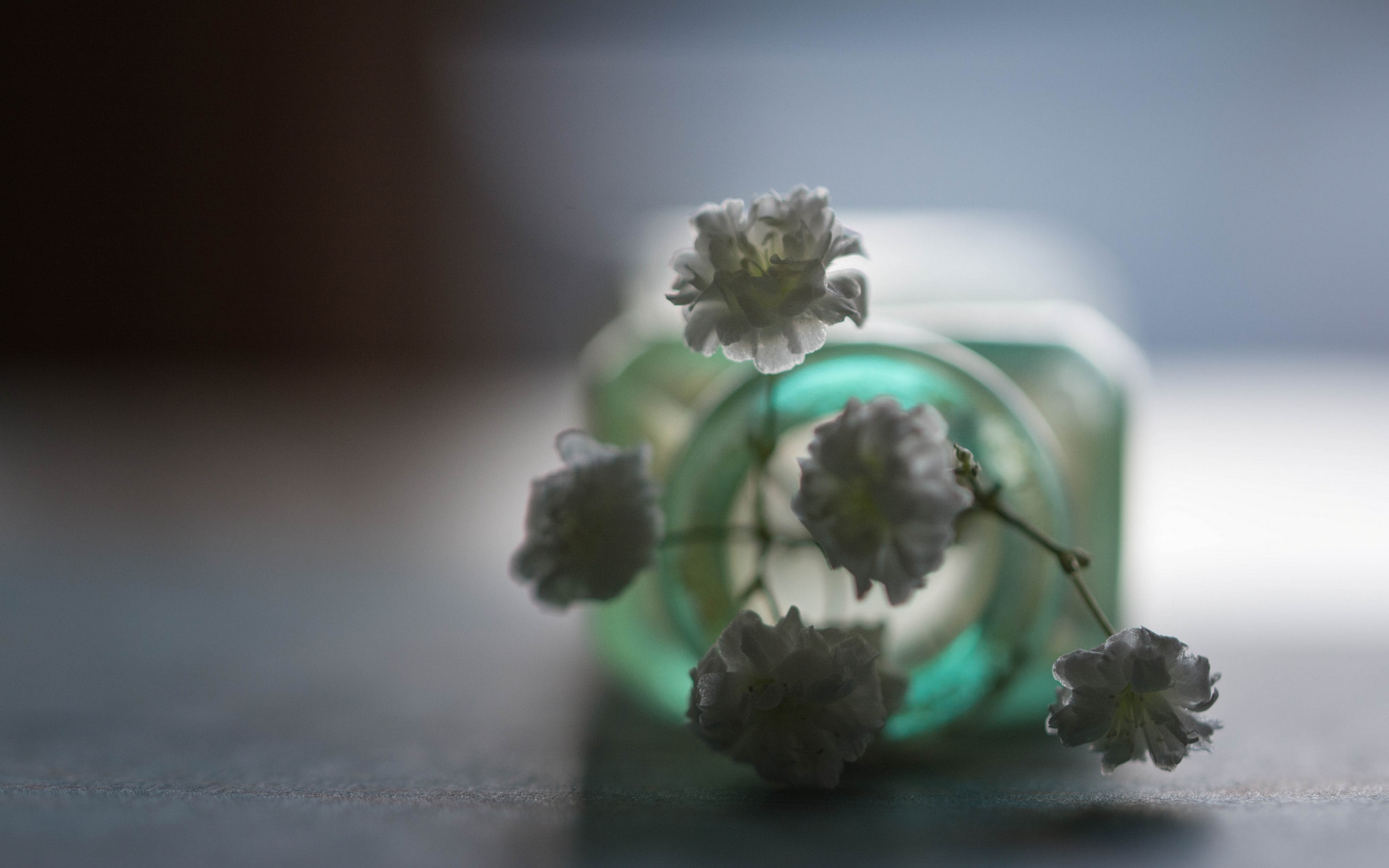 Description: A small flower is sitting on a table next to a small object with a spiral design on it and a blurry background.