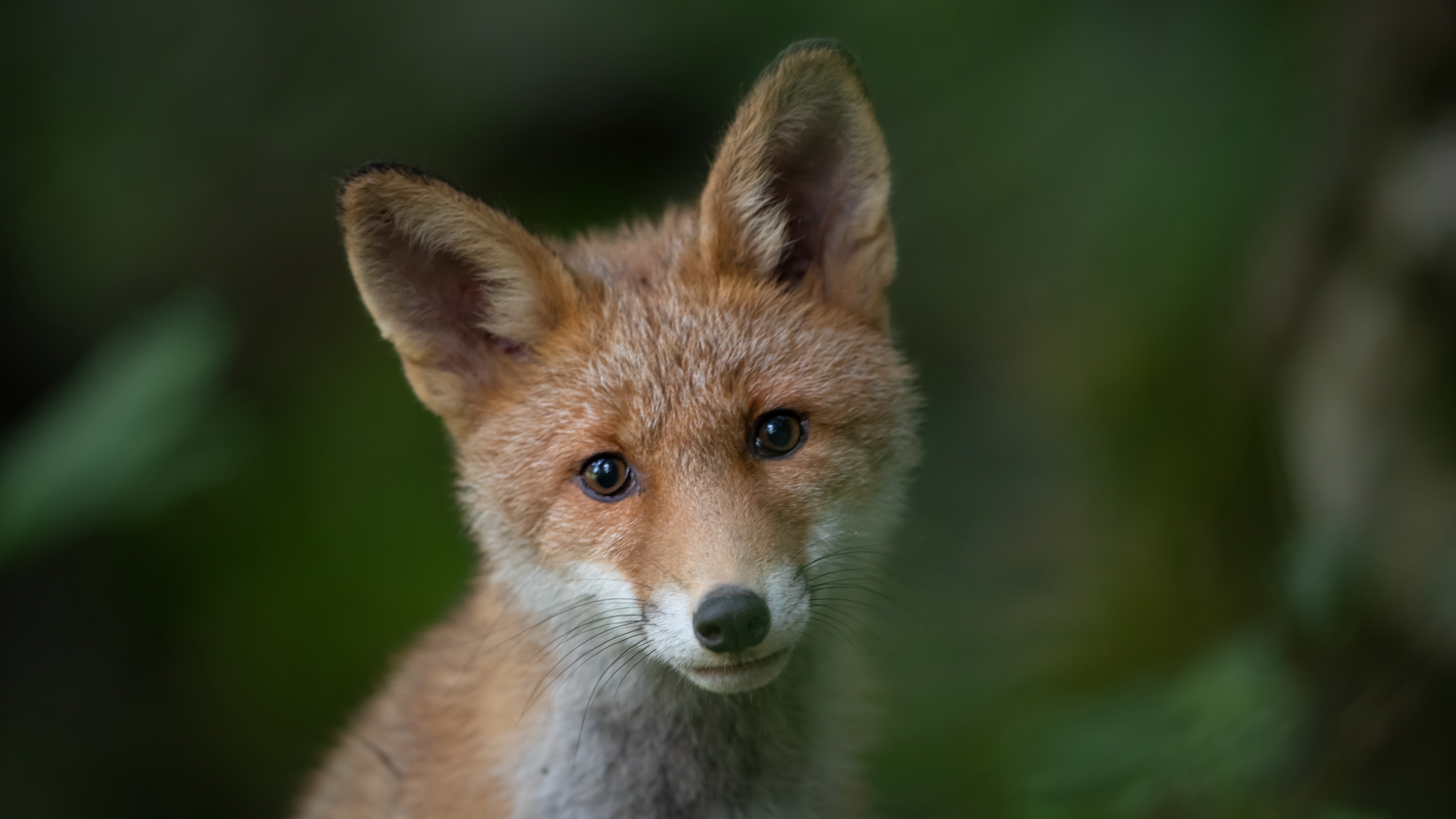 Description: A close up of a small fox with a blurry background of leaves and grass in the foreground.