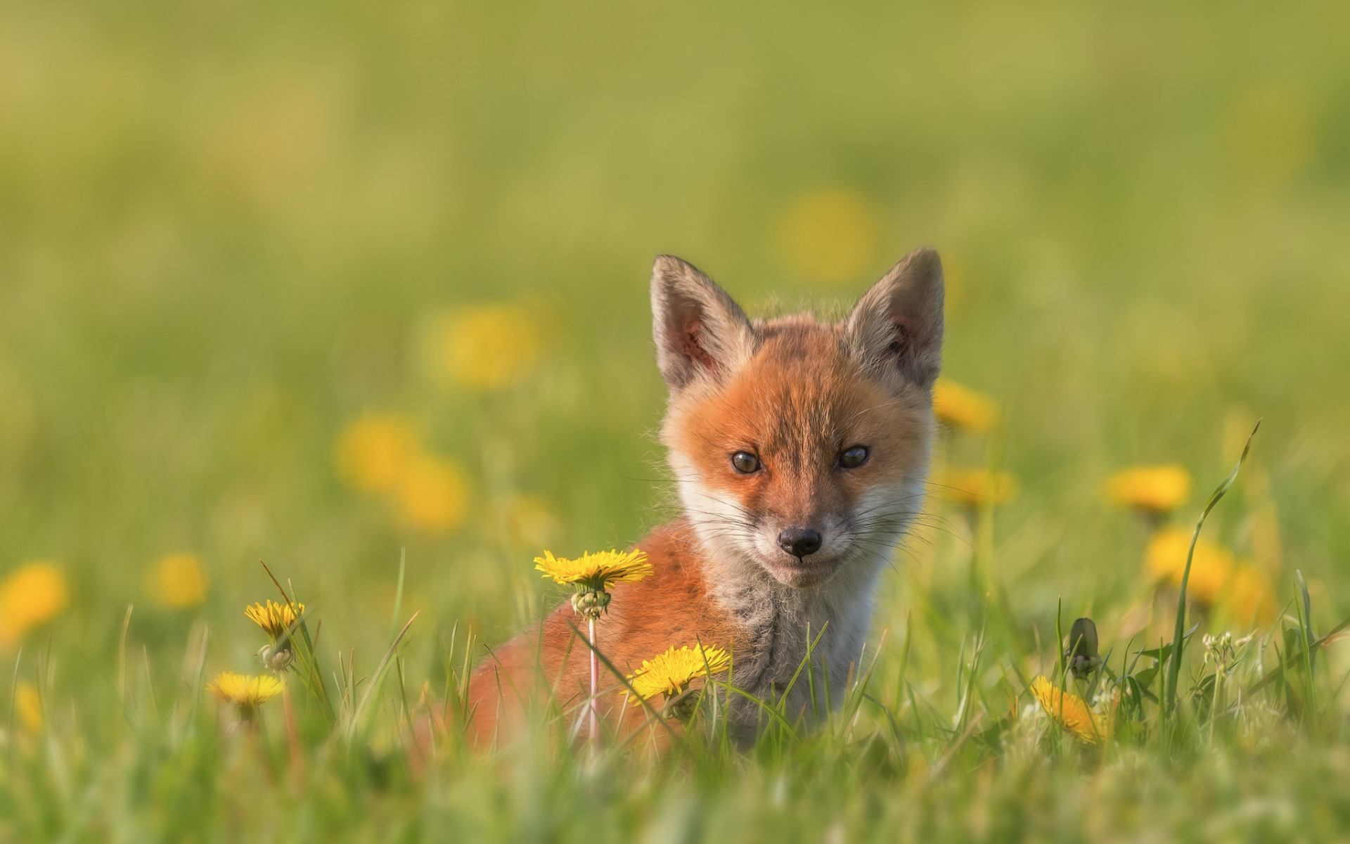 Description: A small fox cub sitting in a field of grass and flowers with a yellow flower in its mouth and looking at the camera.