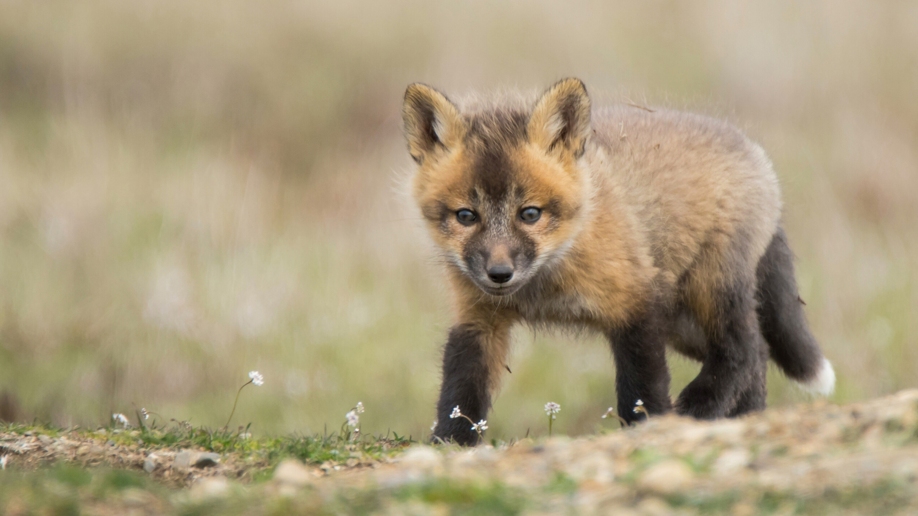 Description: A small fox walking across a grass covered field with a blurry background of grass and flowers in the foreground.