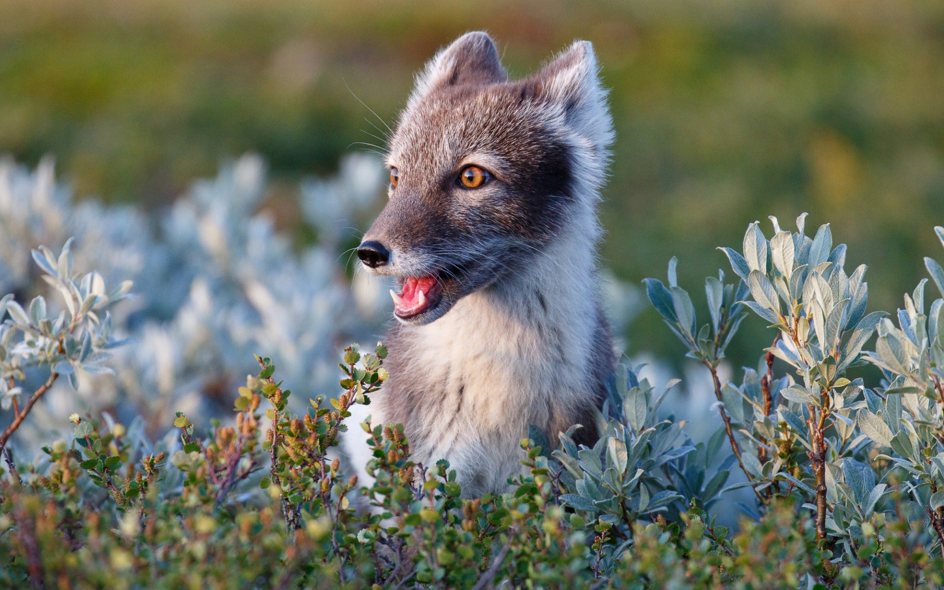 Description: A small gray and white animal sitting in a field of bushes and bushes with its tongue out and tongue out.