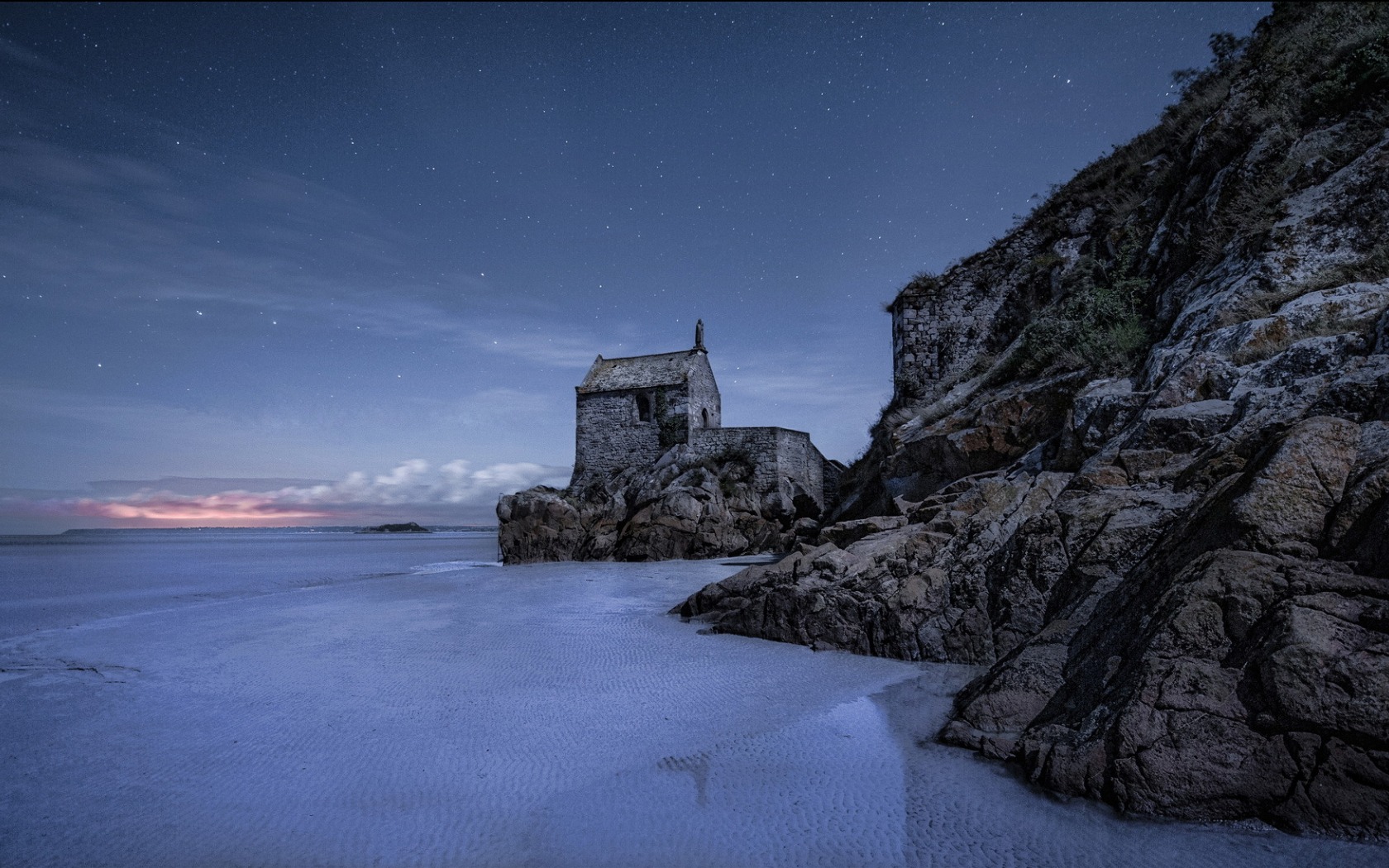 Description: A small house on a rocky cliff by the ocean at night time with a full moon in the sky.
