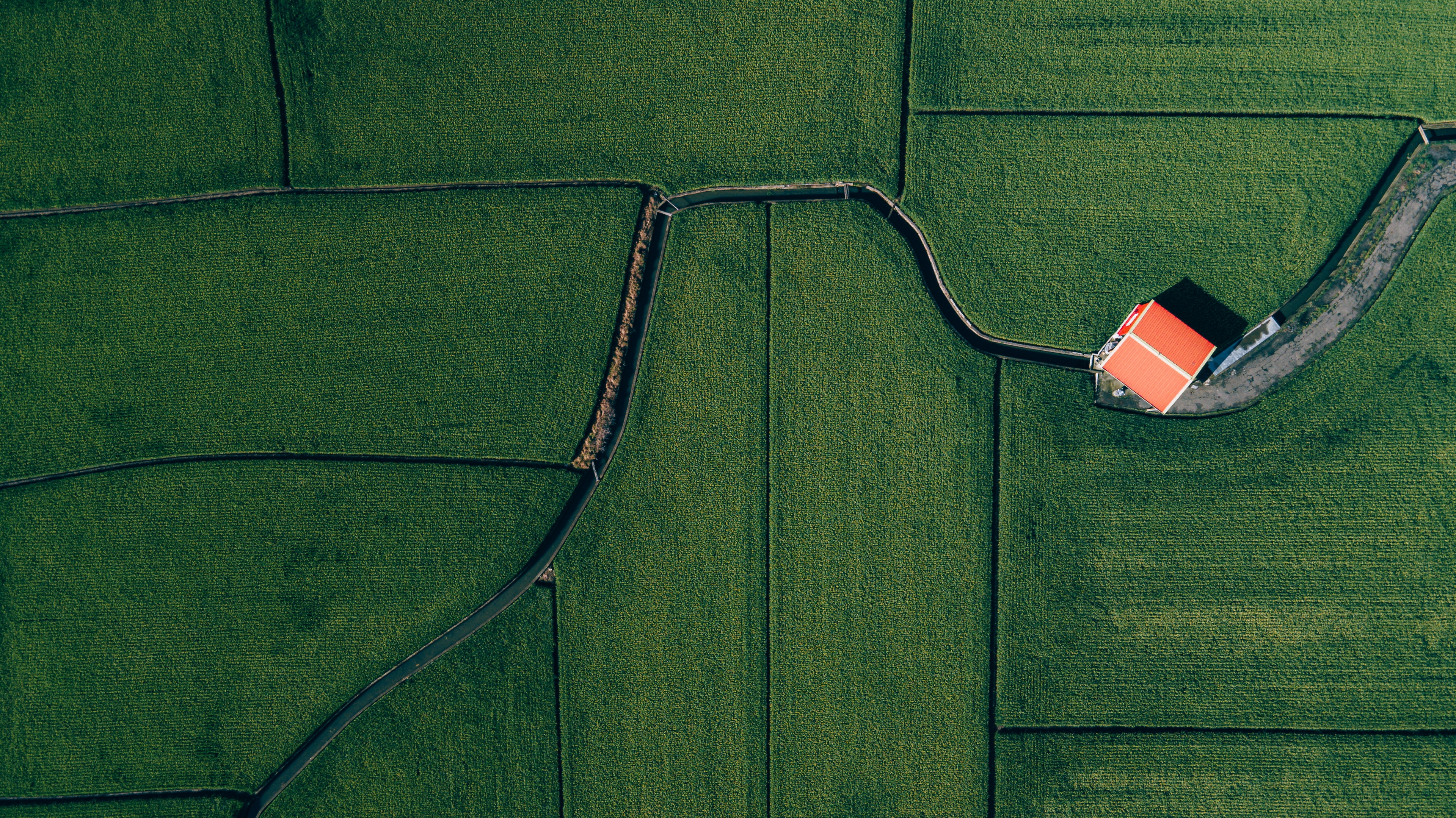 Description: A small house in a green field with a road running through it and a red roof on top of it.