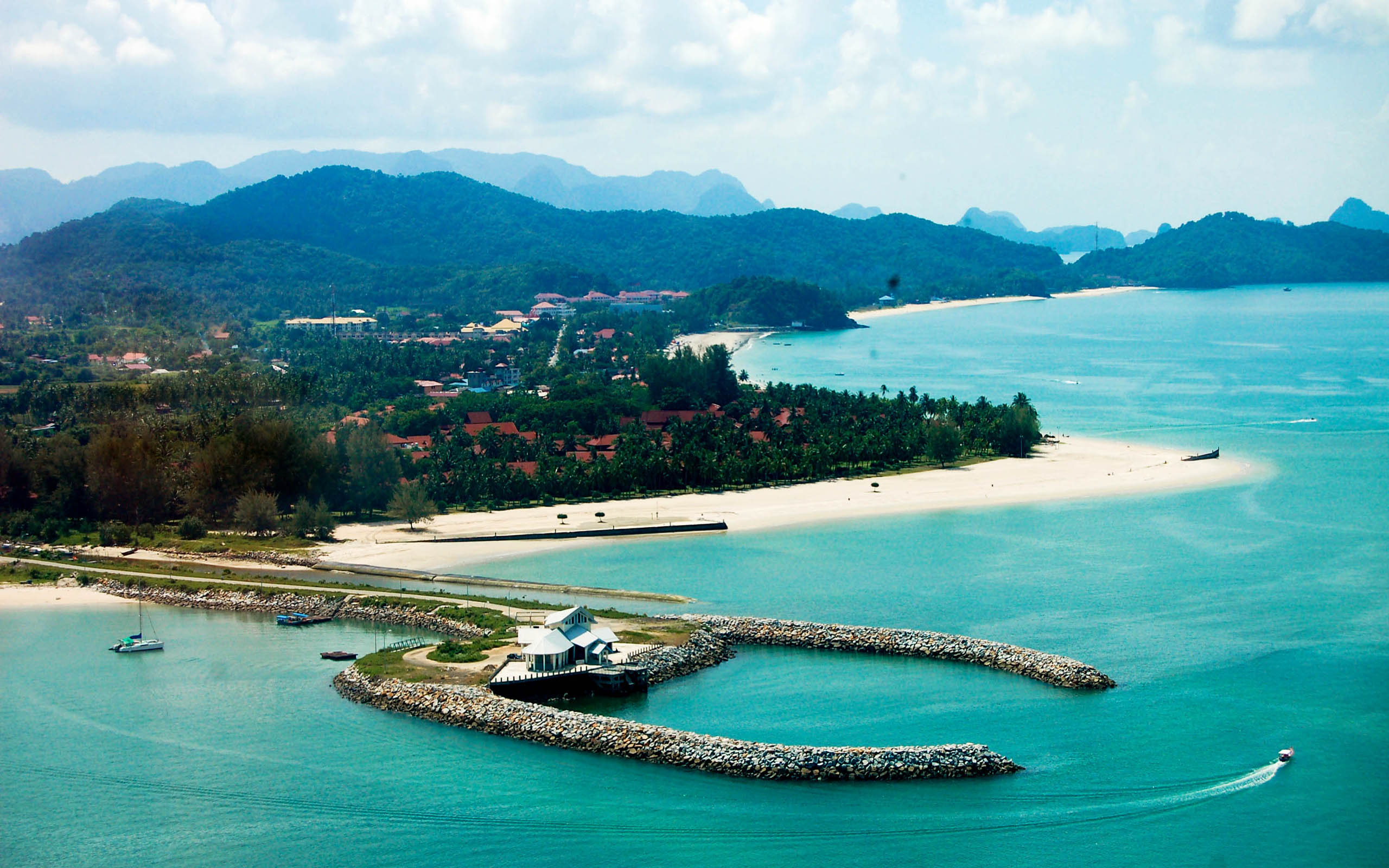 Description: A small island in the middle of a body of water with a dock in the middle of it and a beach in the background.