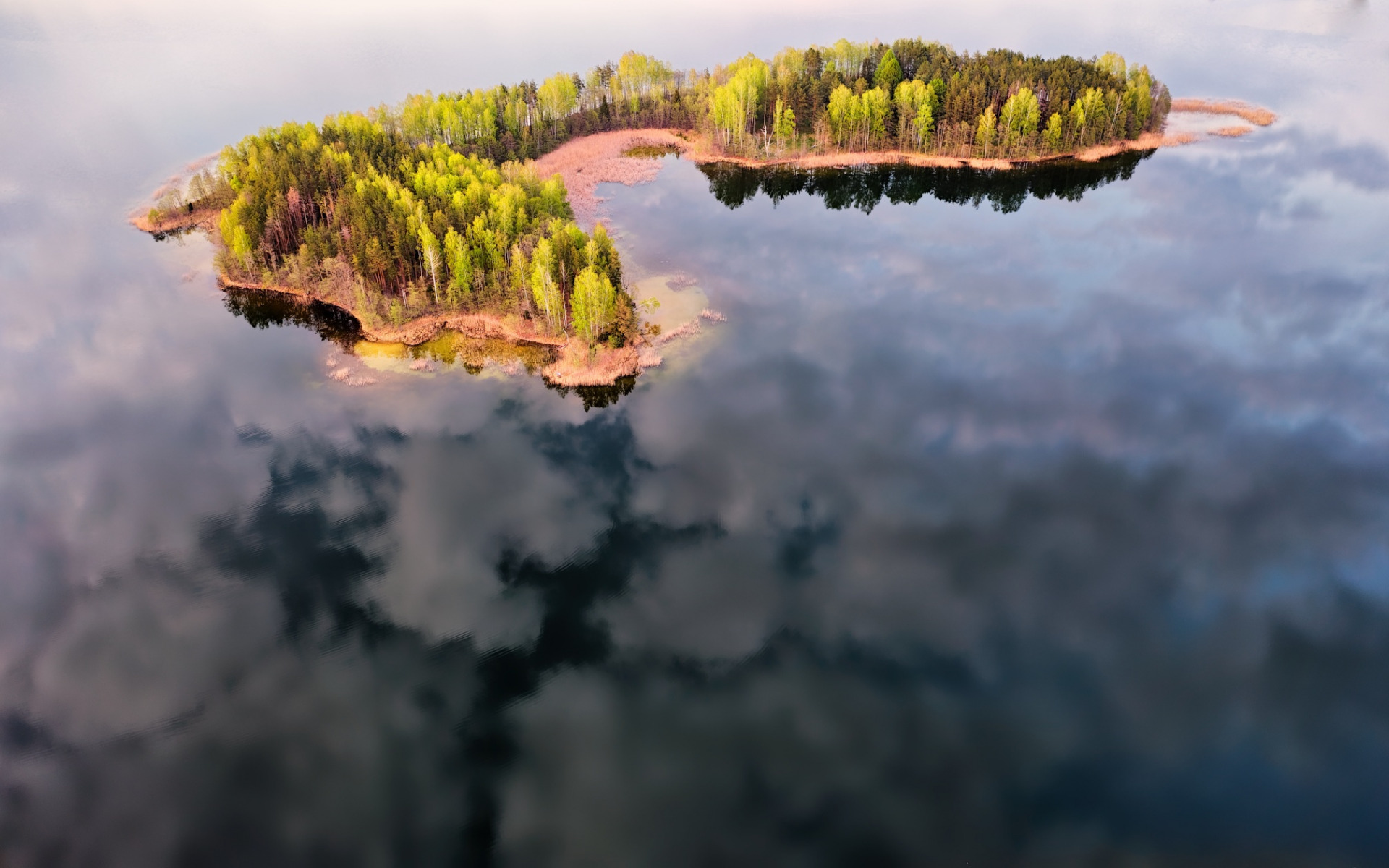 Description: A small island in the middle of a lake surrounded by trees and clouds in the sky with a plane flying over it.