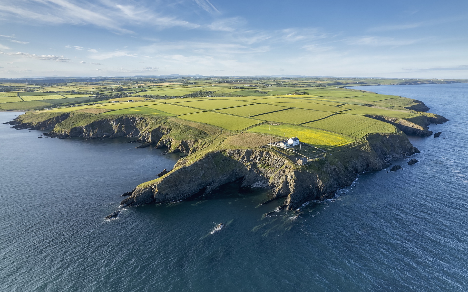 Description: A small island with a lighthouse on top of it in the middle of the ocean with a blue sky.