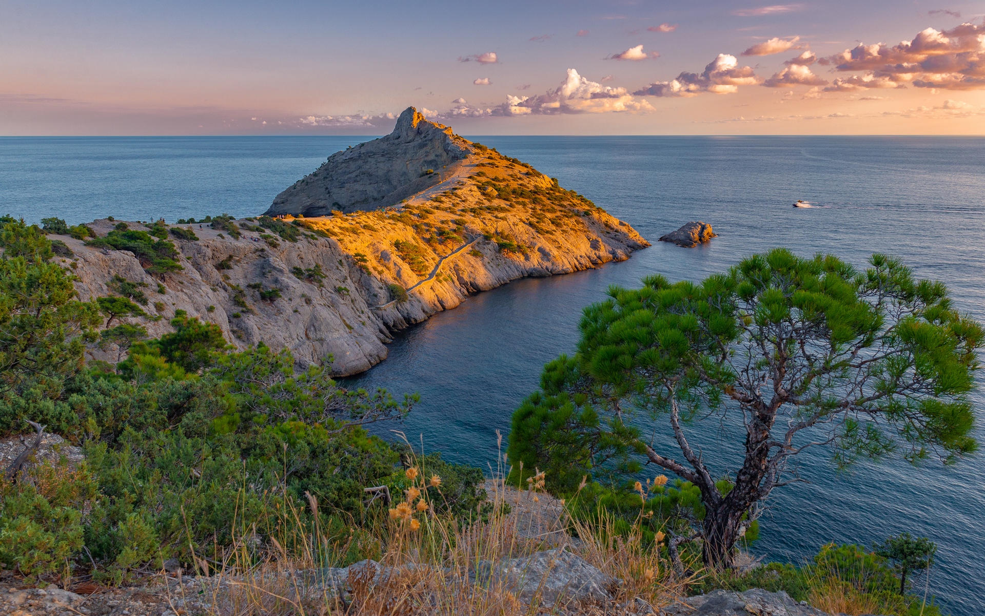 Description: A small island in the middle of the ocean with a tree growing on it's side and a boat in the water.