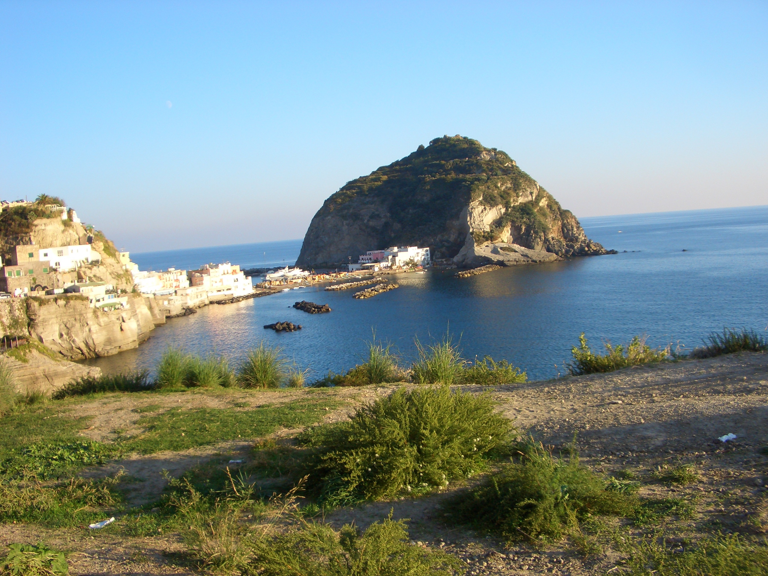 Description: A small island in the middle of a body of water with a small village on top of it and a few boats in the water.