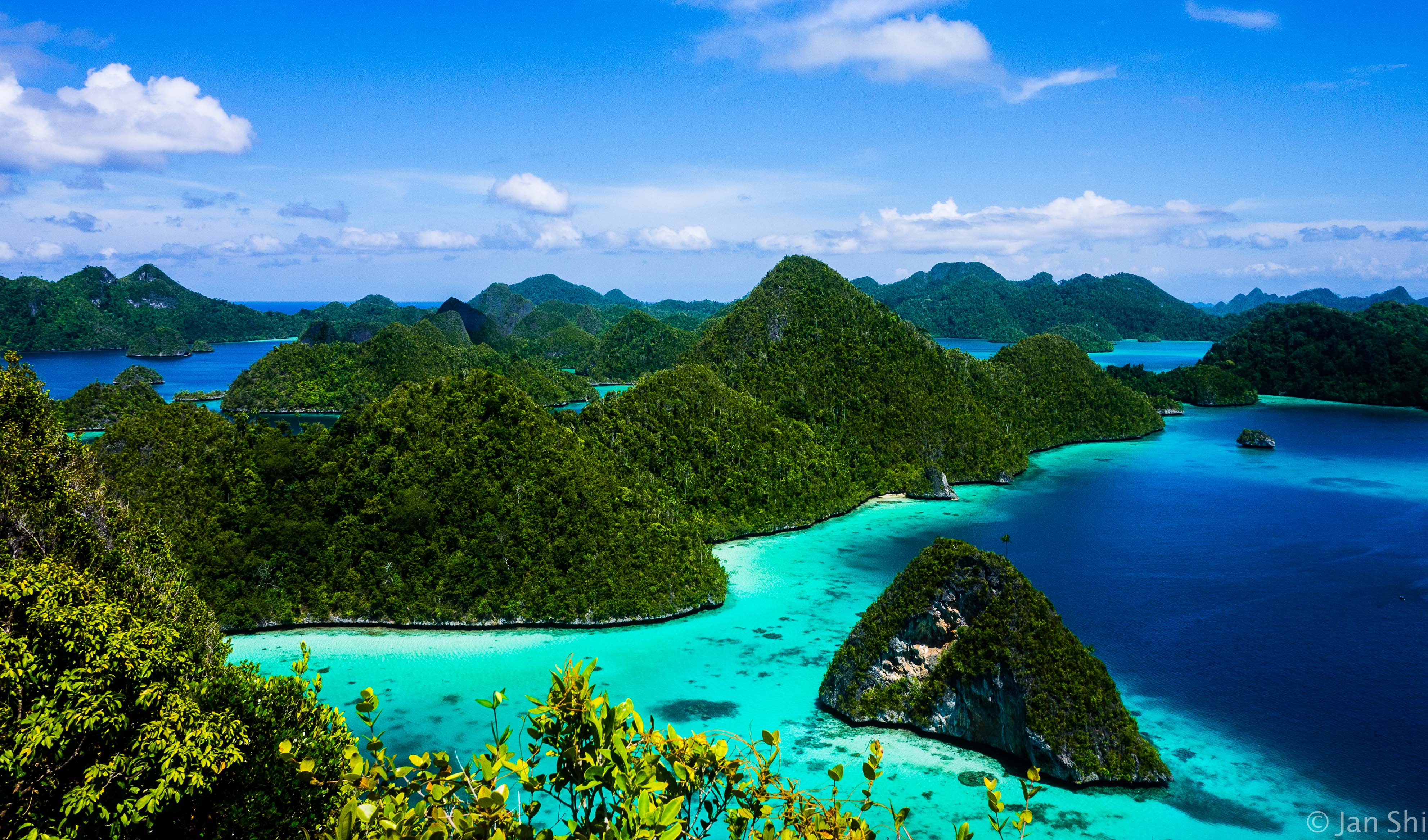 Description: A group of small islands surrounded by water and trees in the foreground.