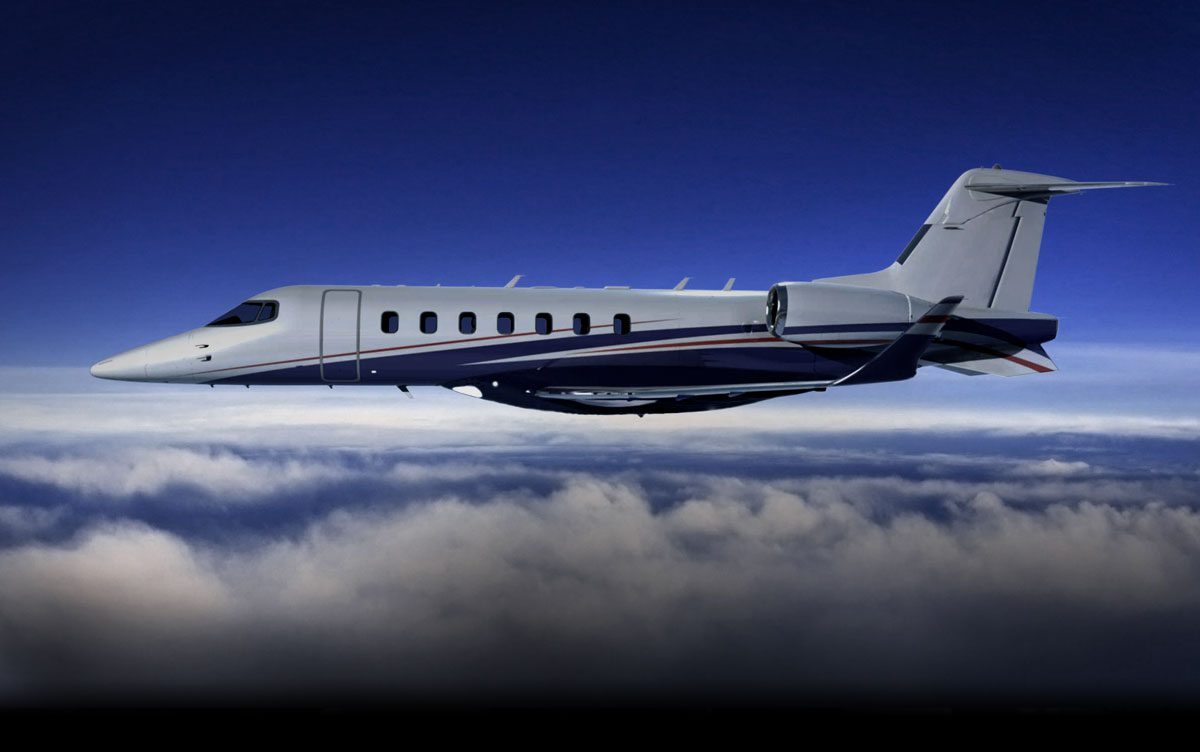 Description: A small jet flying through a blue sky above clouds and clouds below it is a white and blue plane with a red stripe on the side.