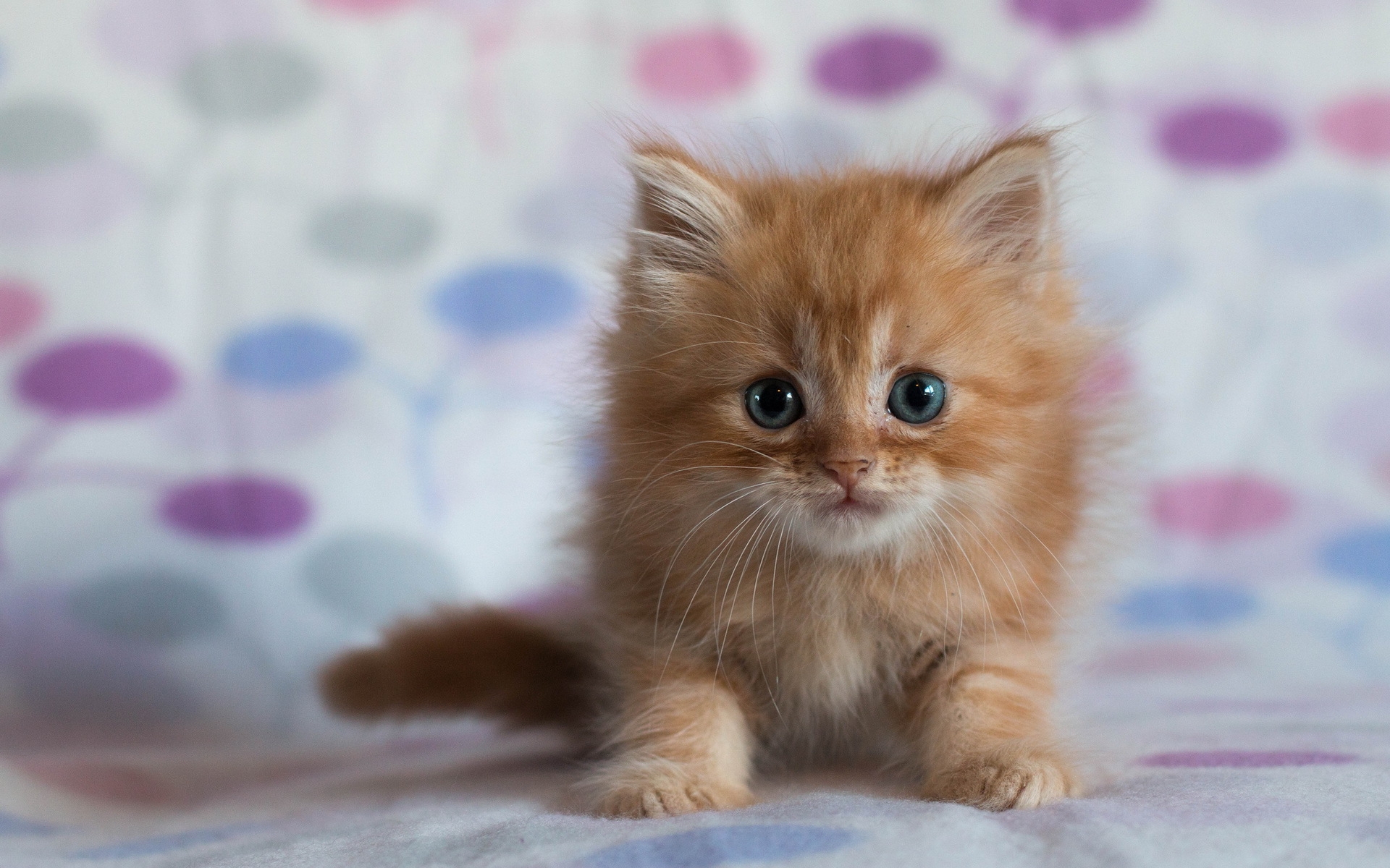 Description: A small kitten with blue eyes sitting on a bed with a floral background and a pink blanket with a white and blue flowered design.