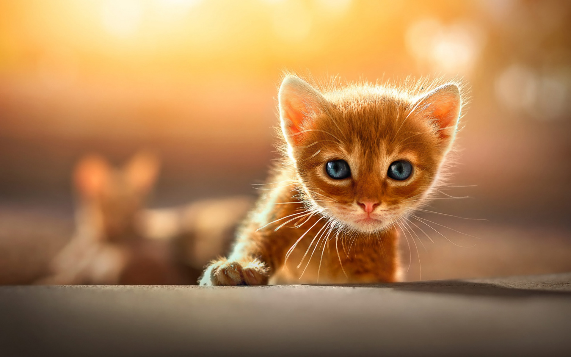 Description: A small kitten with blue eyes is looking at the camera while another kitten is laying down behind it and another kitten is looking at the camera.
