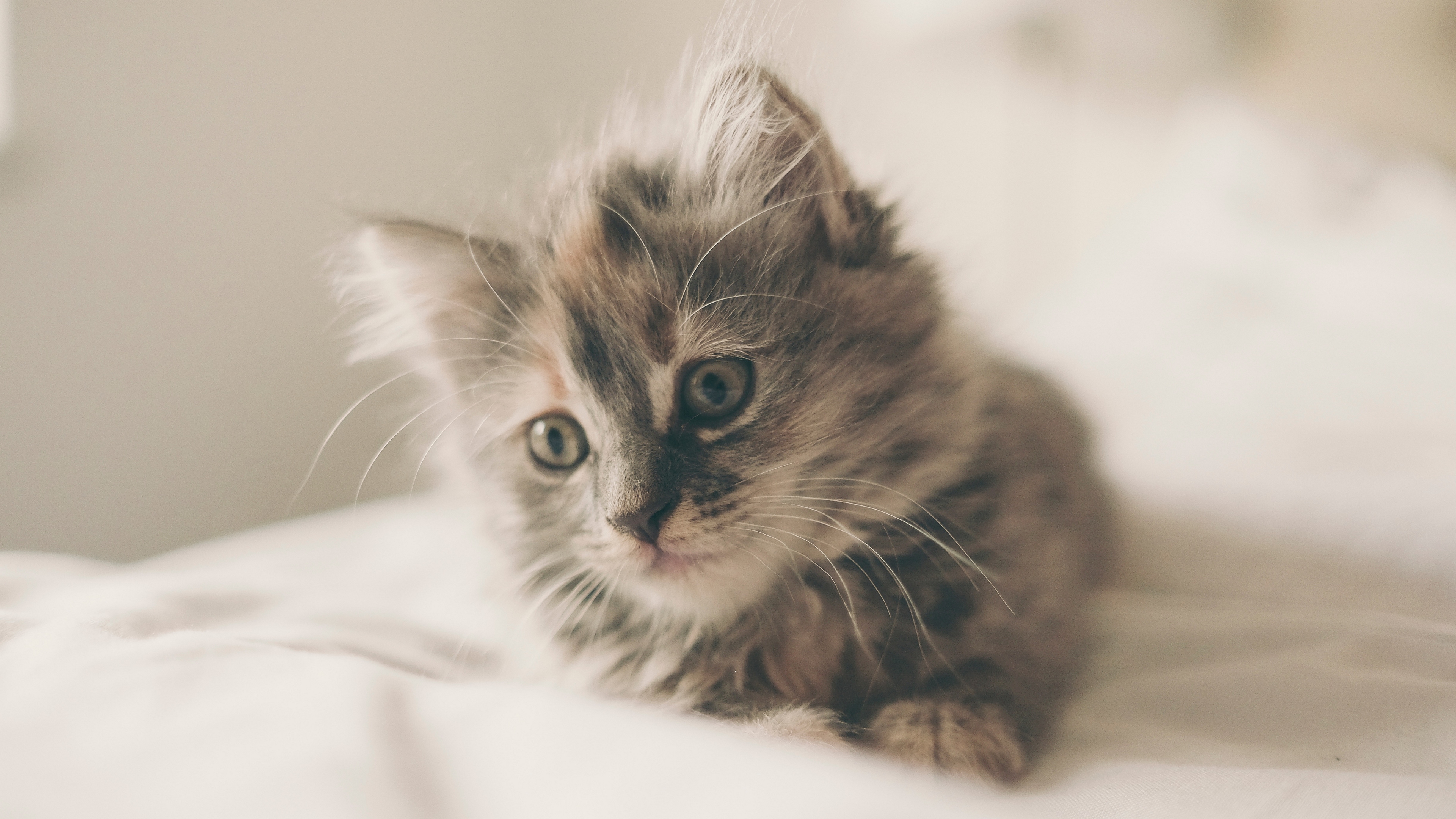 Description: A small kitten is sitting on a bed looking at the camera with a sad look on its face and eyes.