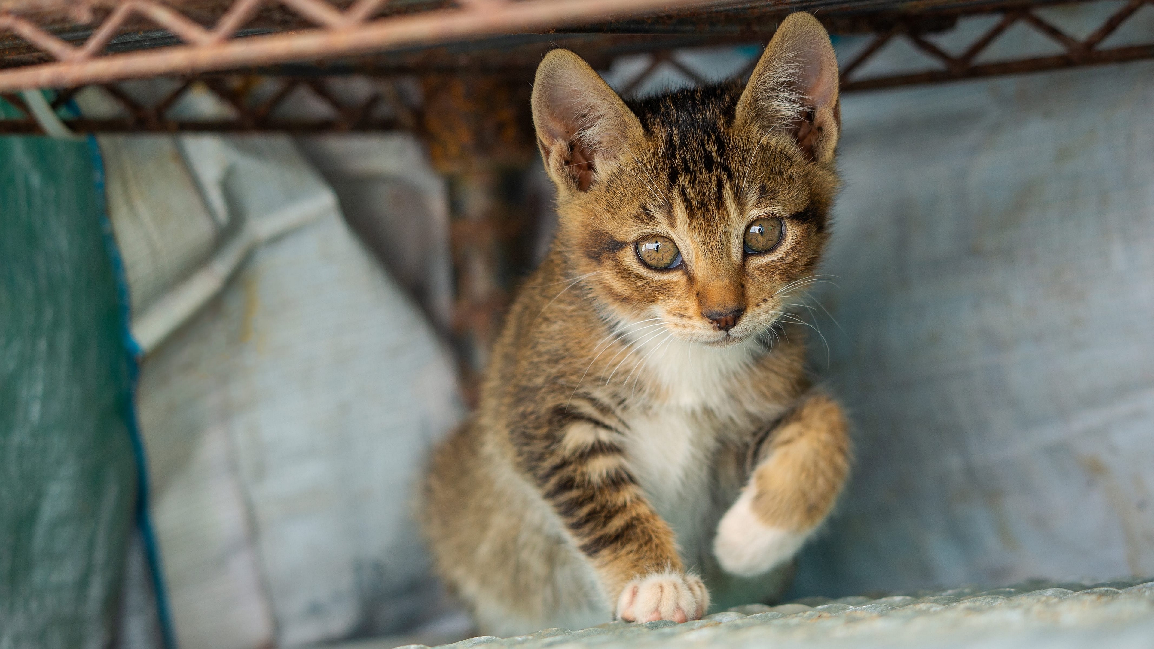 Description: A small kitten is standing on a shelf and looking at the camera with a curious look on its face.