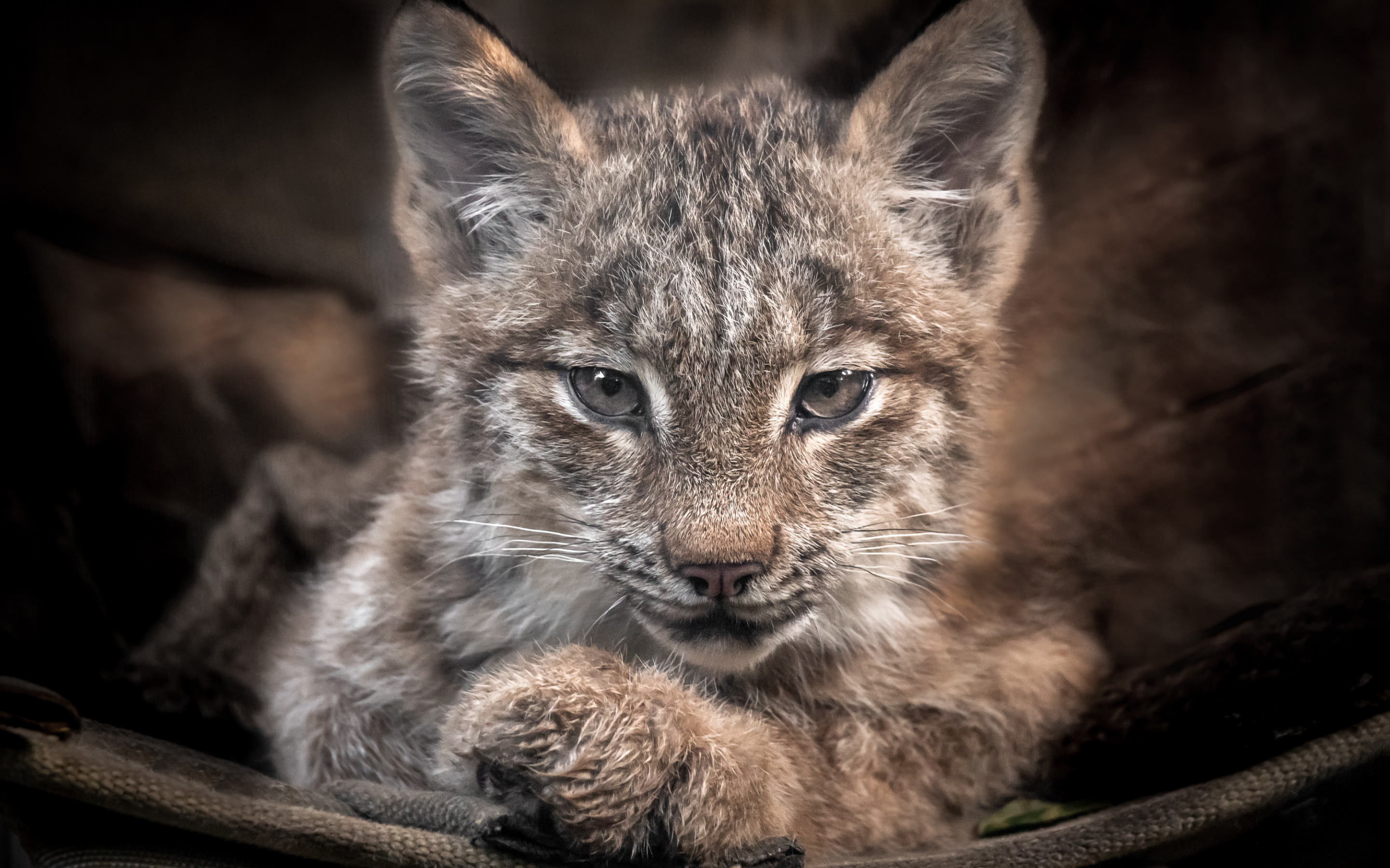 Description: A small kitten is sitting in a chair looking at the camera with a sad look on its face and paw.