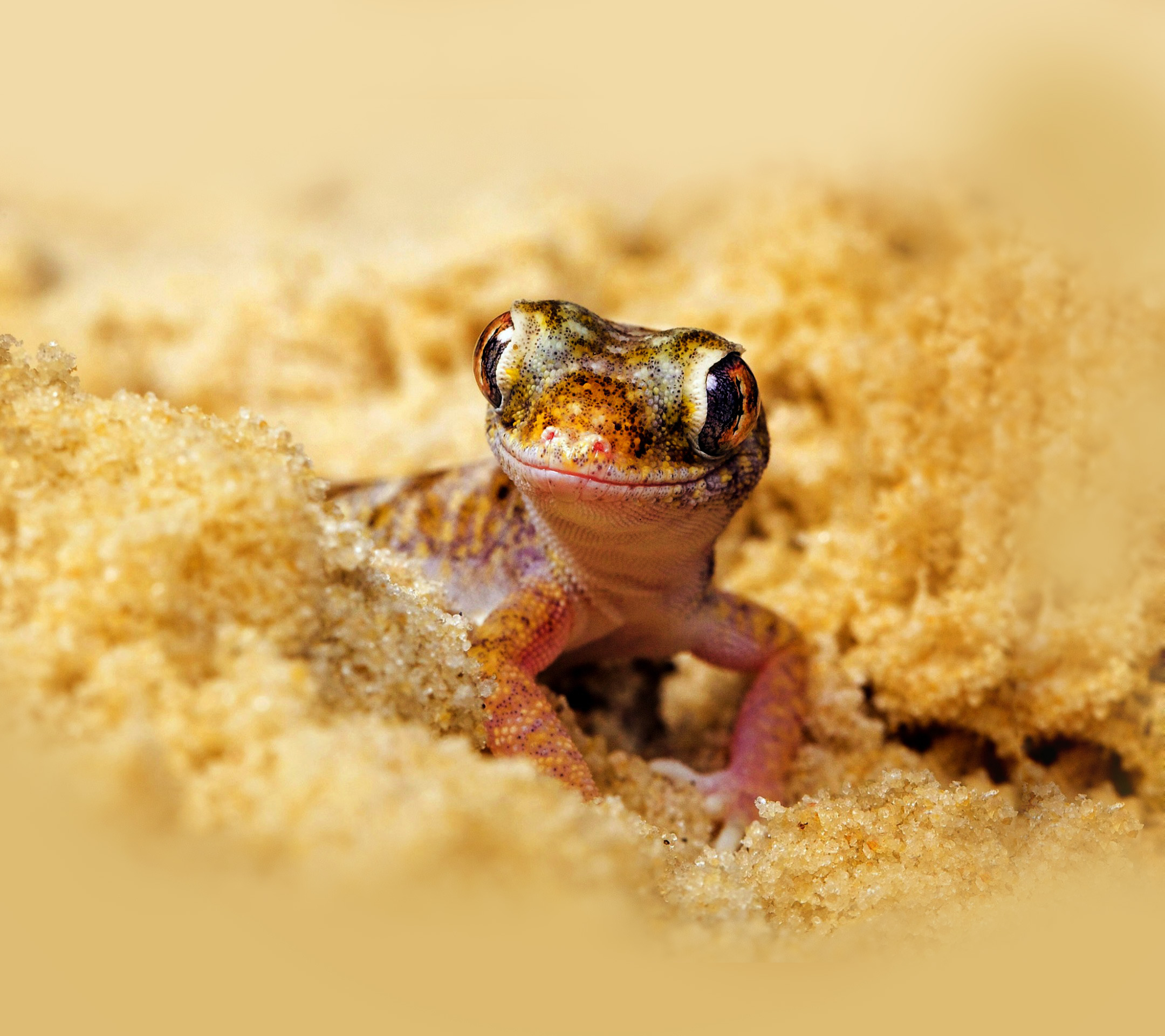 Description: A small lizard is sitting in the sand and looking at the camera manoen the picture is taken in the desert.