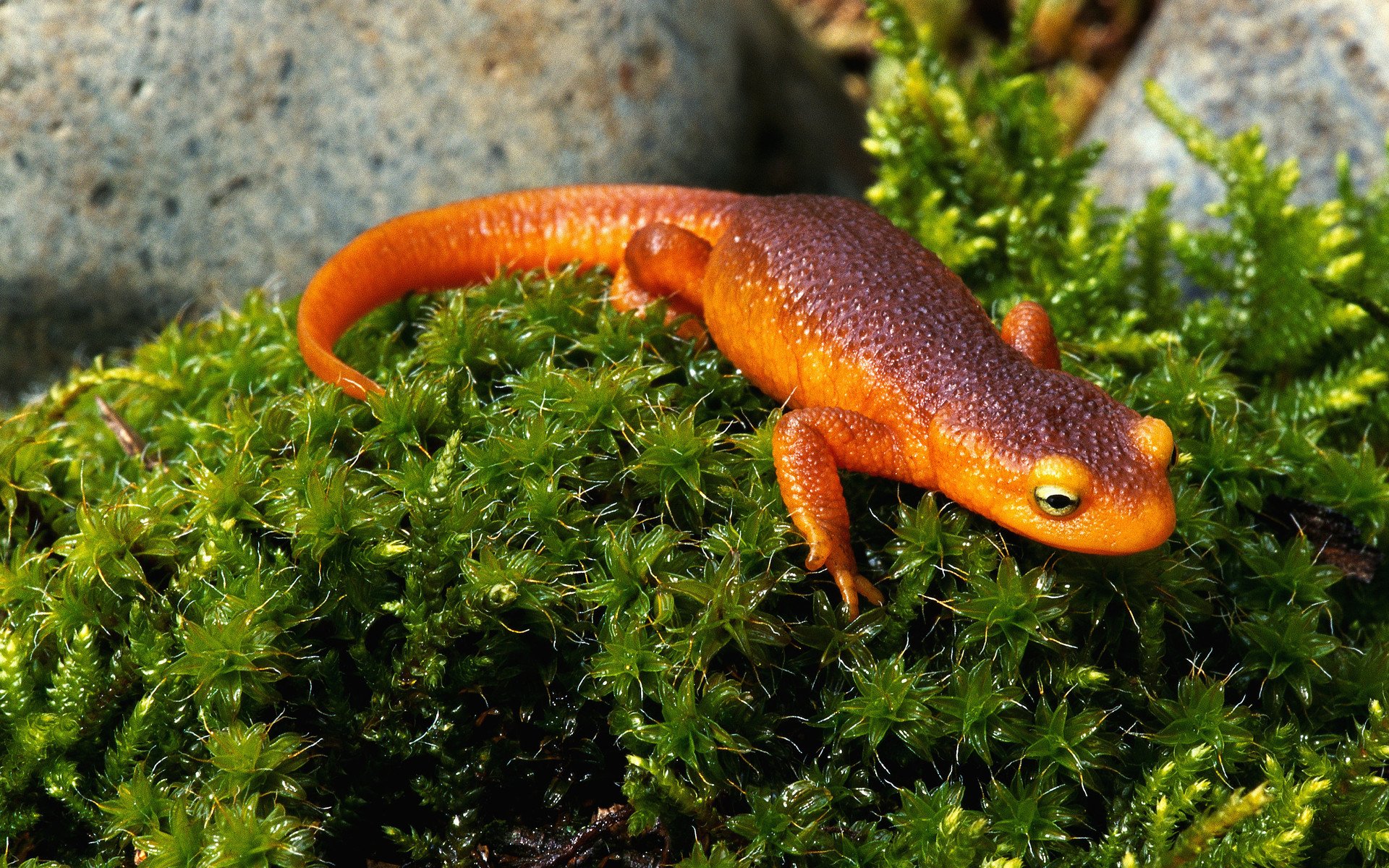 Description: A small orange lizard sitting on top of a green plant covered in mossy grass and rocks with a black dot on the face.