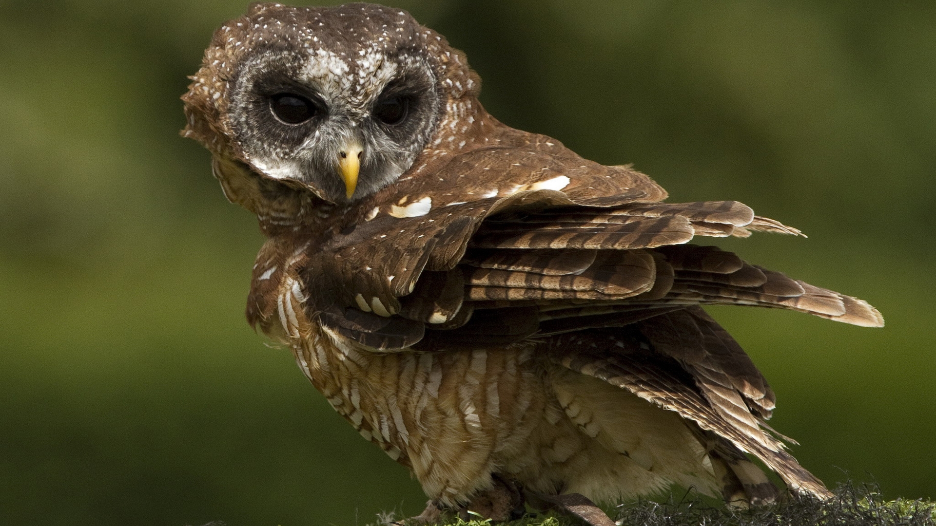 Description: A small owl sitting on top of a moss covered tree stump with its eyes closed and a yellow beak.