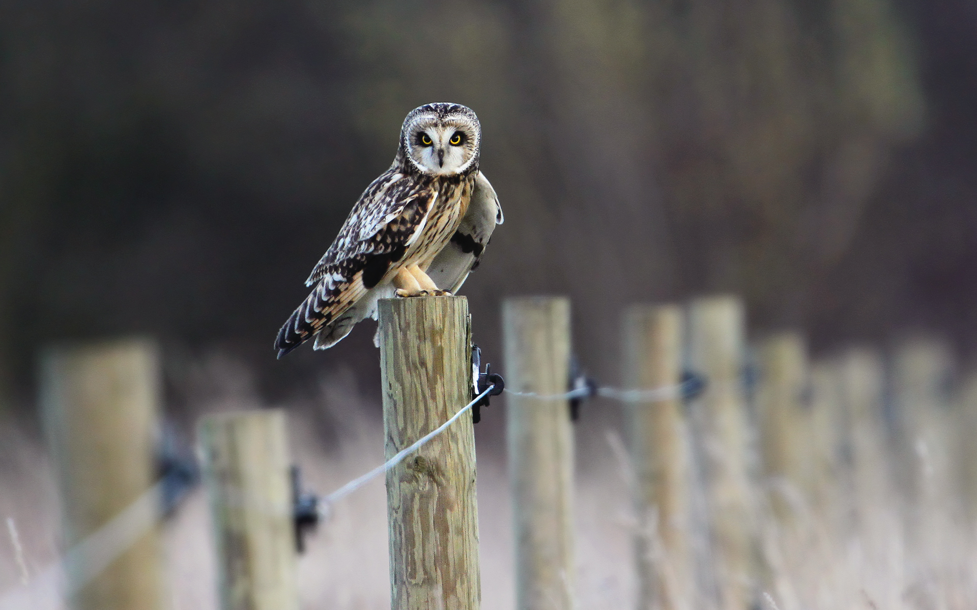 Description: A small owl perched on a wooden post in a field of tall grass and barbed wire fence posts in the background.