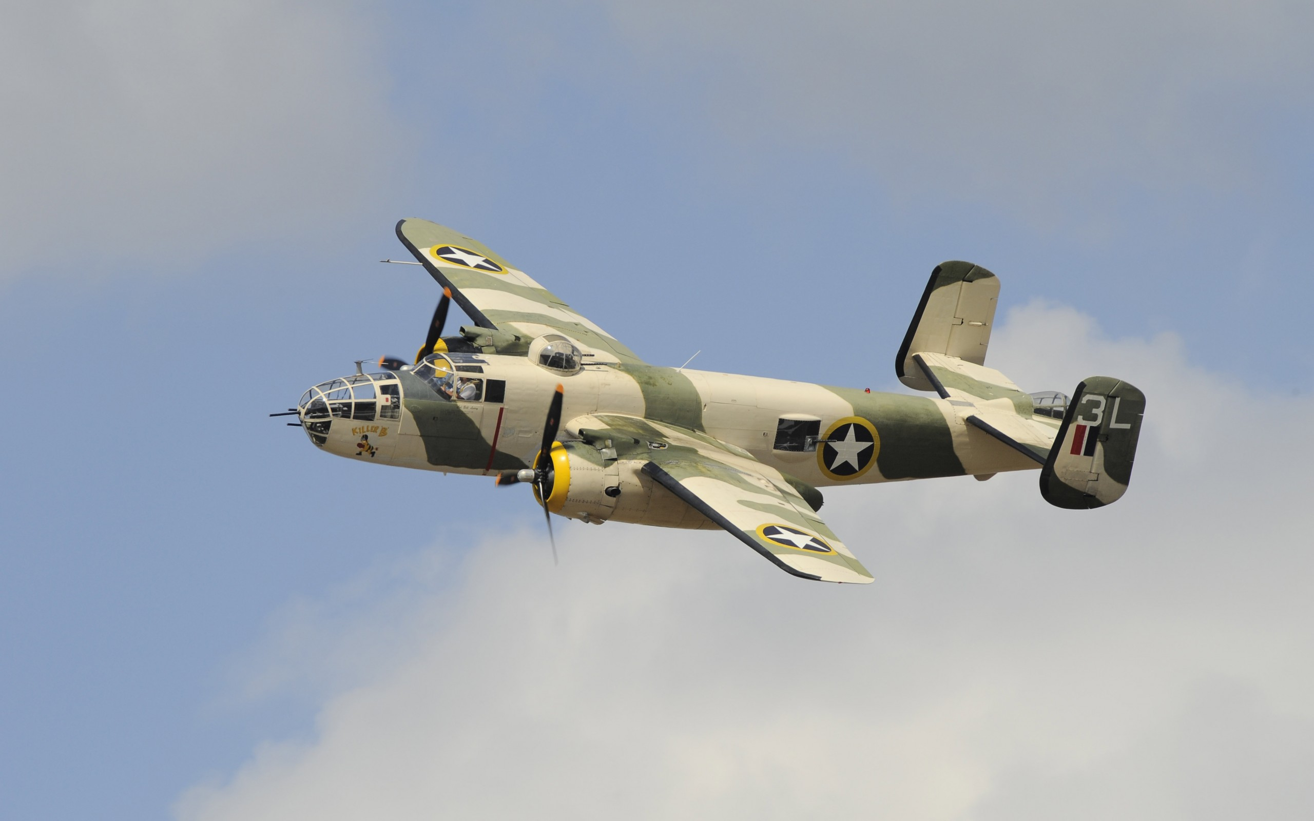 Description: A small plane flying through a cloudy sky with a propeller on it's side and a propeller on the front of the plane.
