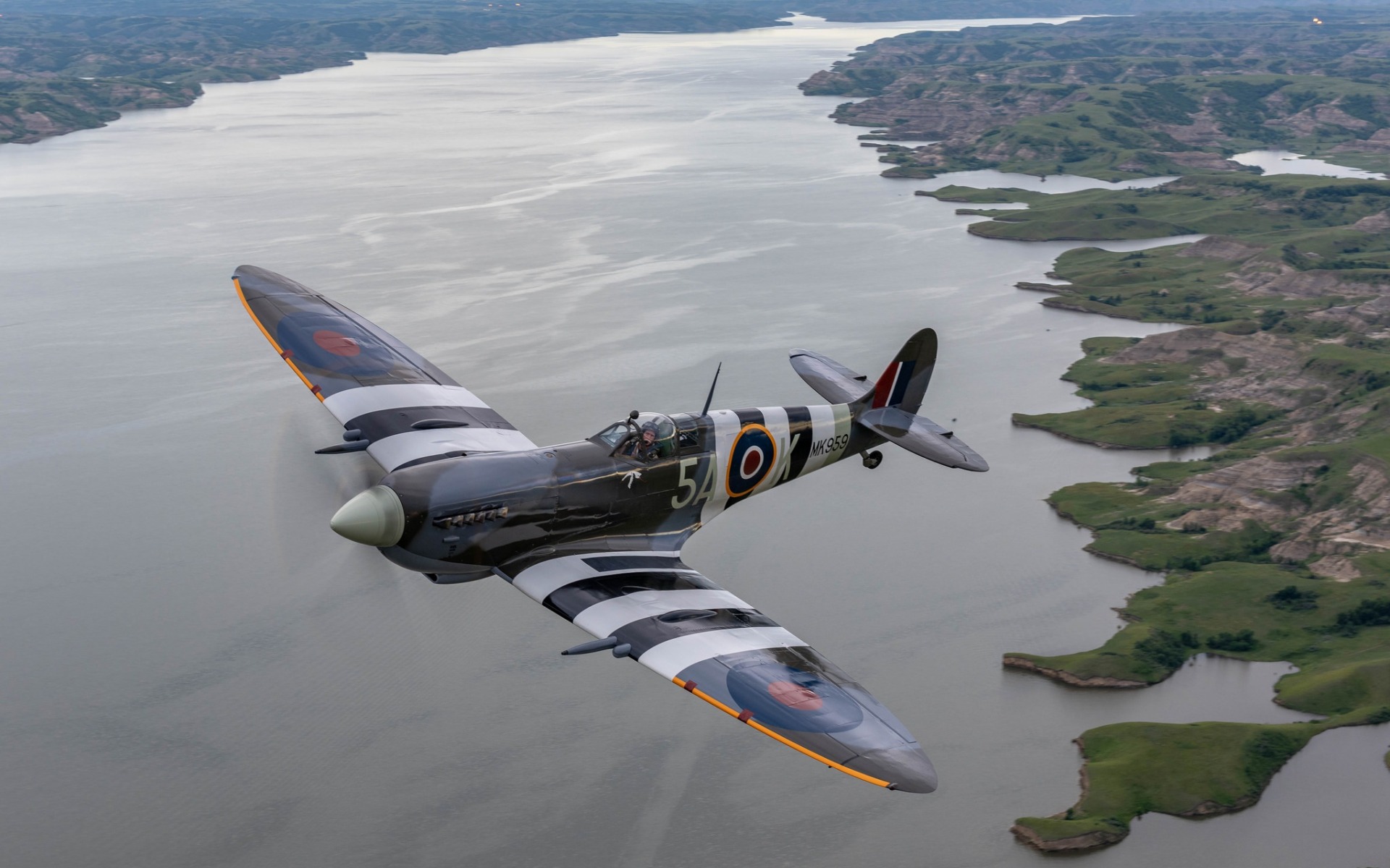 Description: A small plane flying over a large body of water near a forest of trees and landforms in the distance.