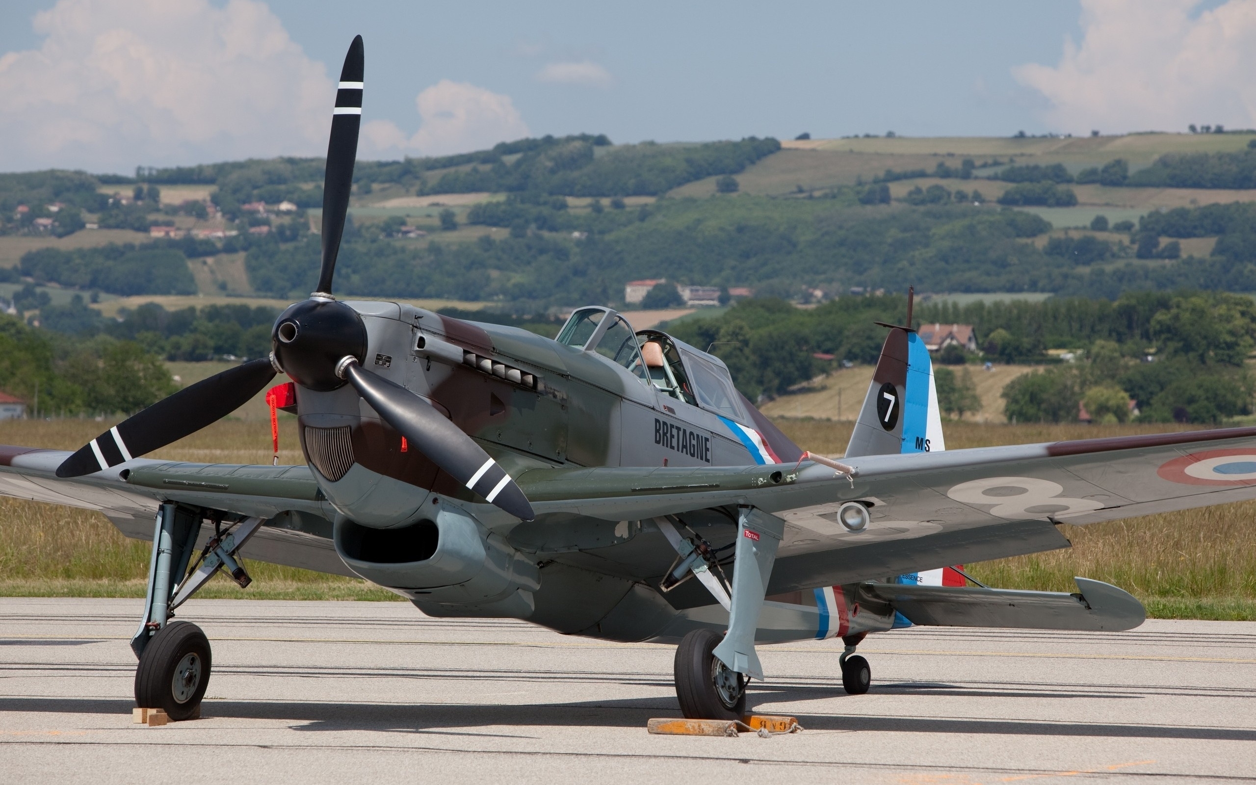 Description: A small plane sitting on top of an airport runway with a sky background and trees in the background.