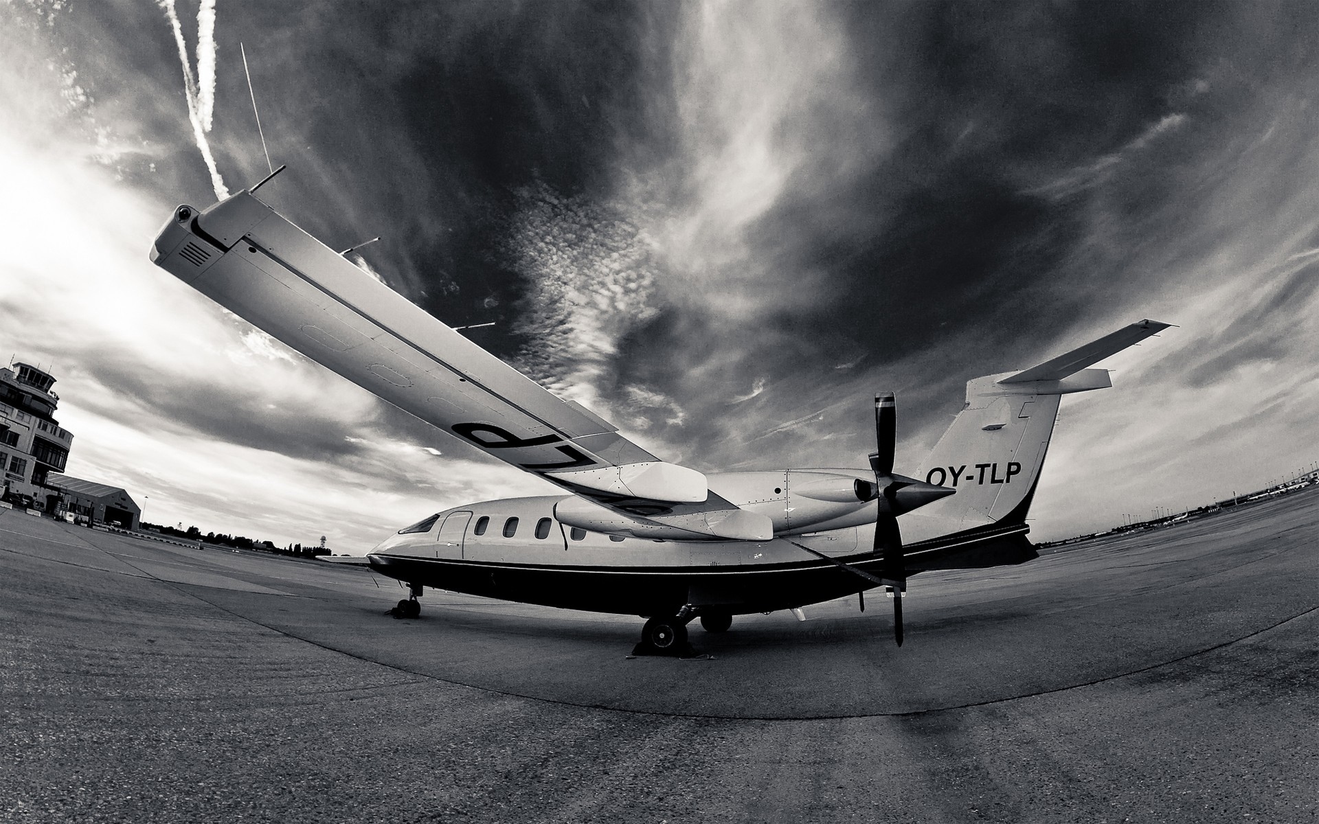 Description: A small plane sitting on top of an airport tarmac under a cloudy sky with a jet engine on the wing.