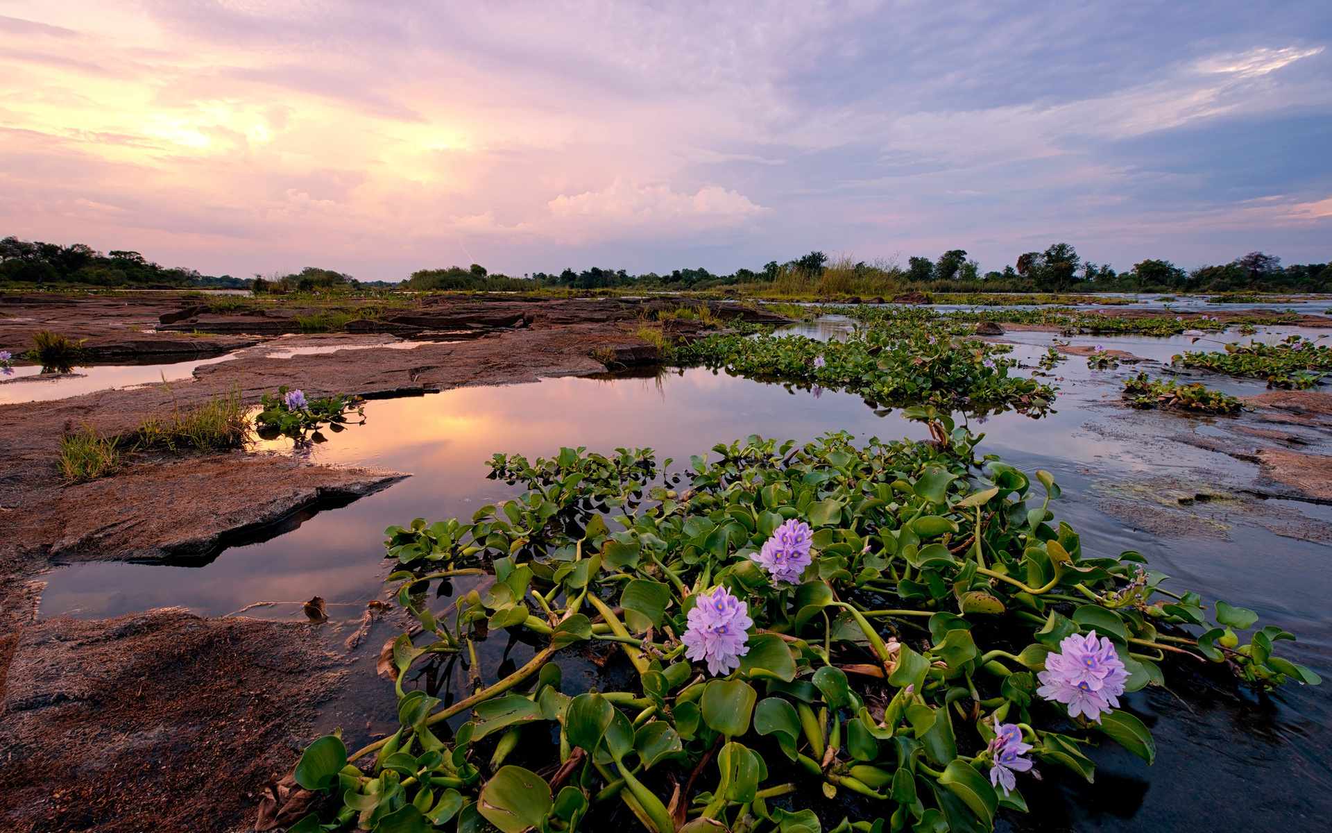 Description: A small pond with purple flowers in it and a sunset in the background with clouds in the sky above.