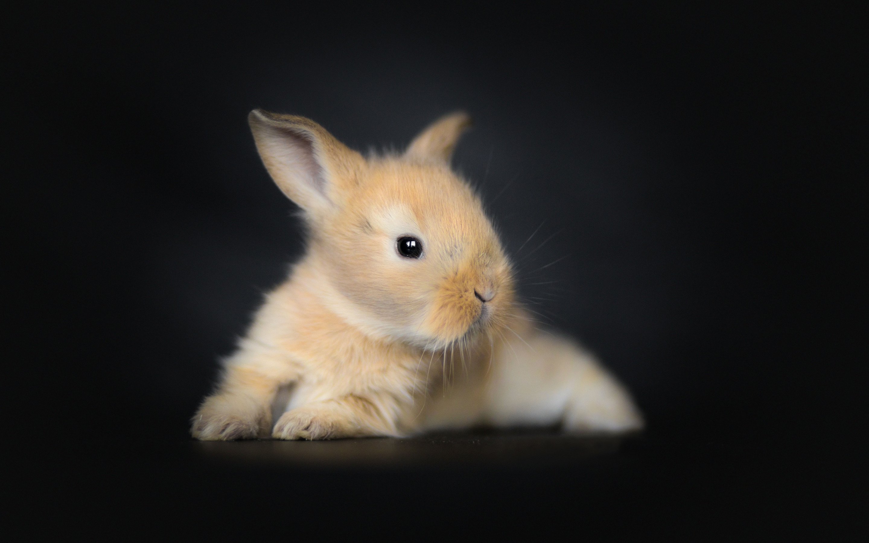 Description: A small rabbit sitting on a black surface with a black background and a black background behind it.