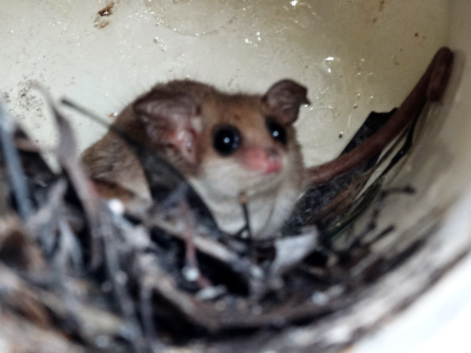 Description: A small rodent sitting in a nest with twigs in it's mouth and looking at the camera.