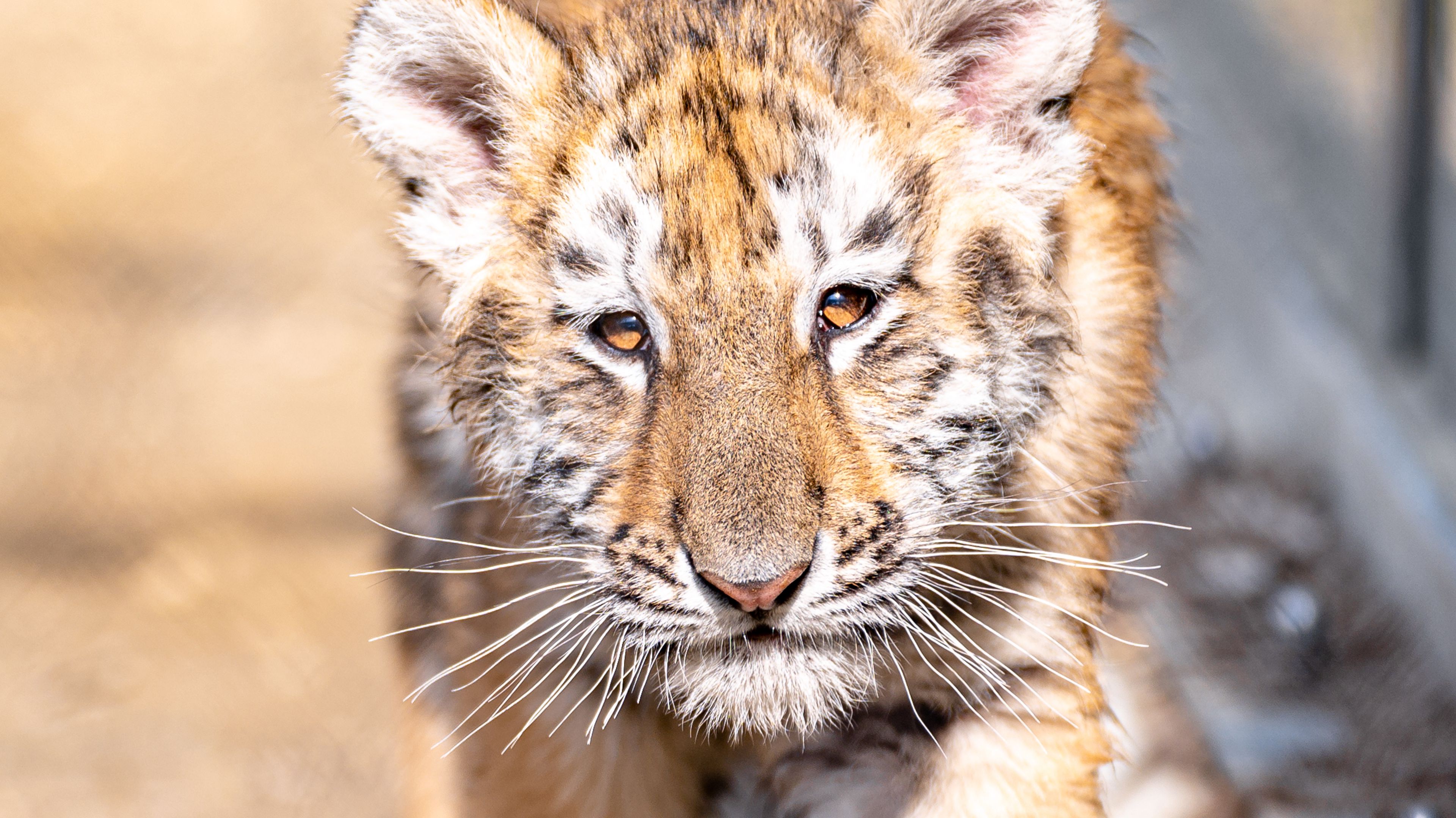 Description: A close up of a small tiger walking on a dirt ground with a blurry background of grass and dirt.