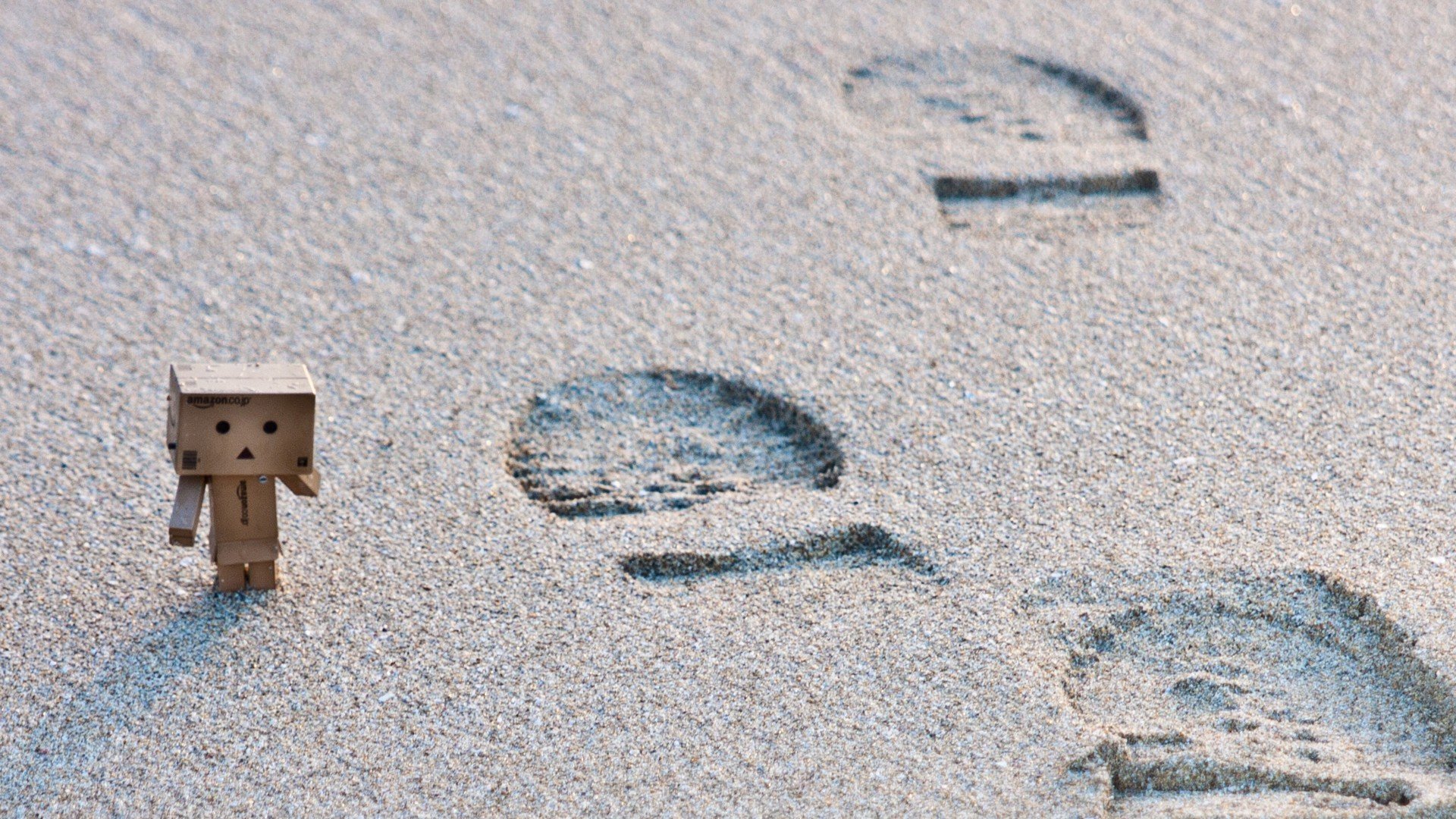 Description: A small toy standing in the sand next to a small toy figure with a face on it's face.