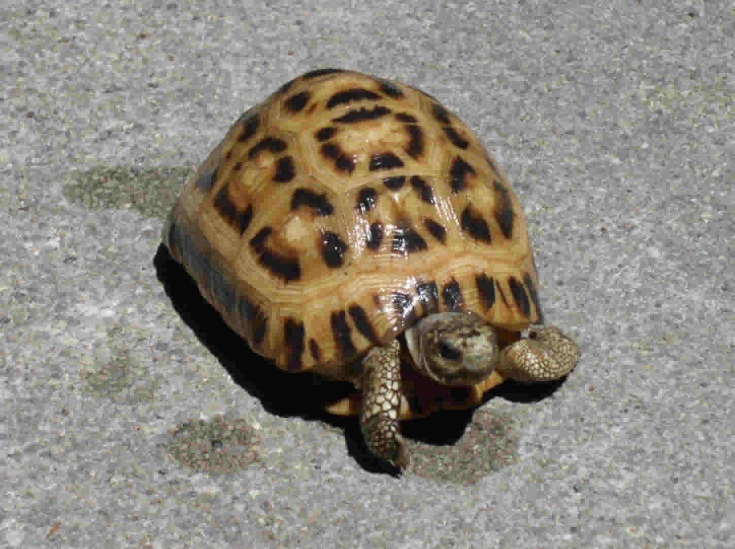 Description: A small turtle is sitting on the ground and looking up at the camera man's eye is on the ground.