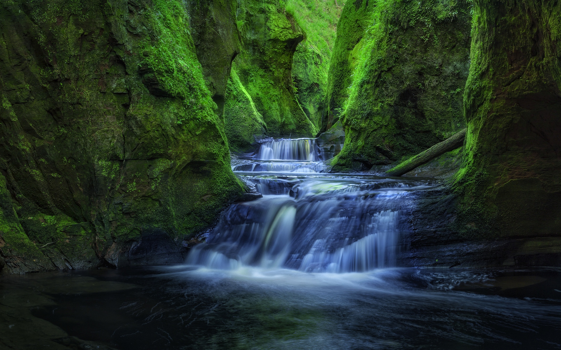 Description: A small waterfall in a green forest with mossy rocks and trees on either side of it and a stream running between the rocks.