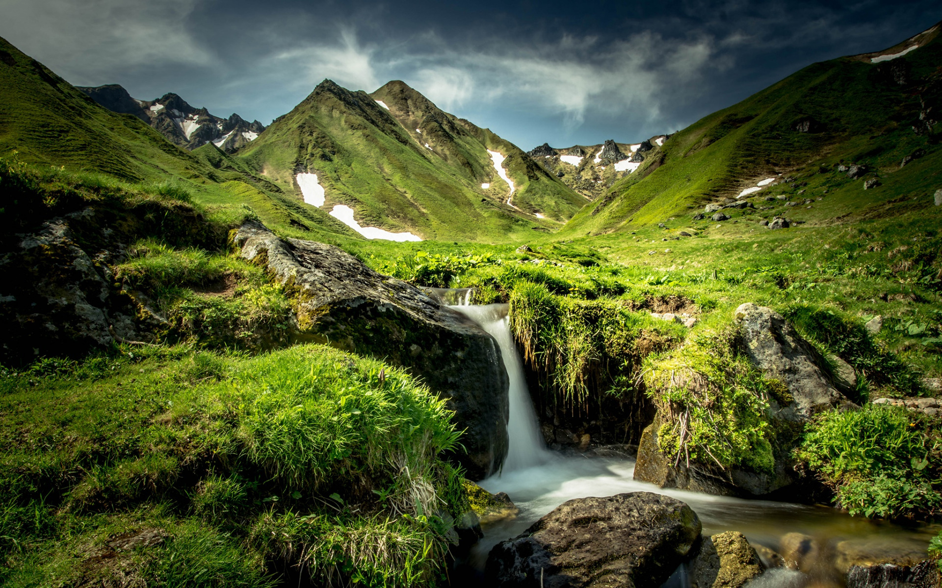 Description: A small waterfall running through a lush green valley under a cloudy sky with mountains in the background and a green grass covered valley below.