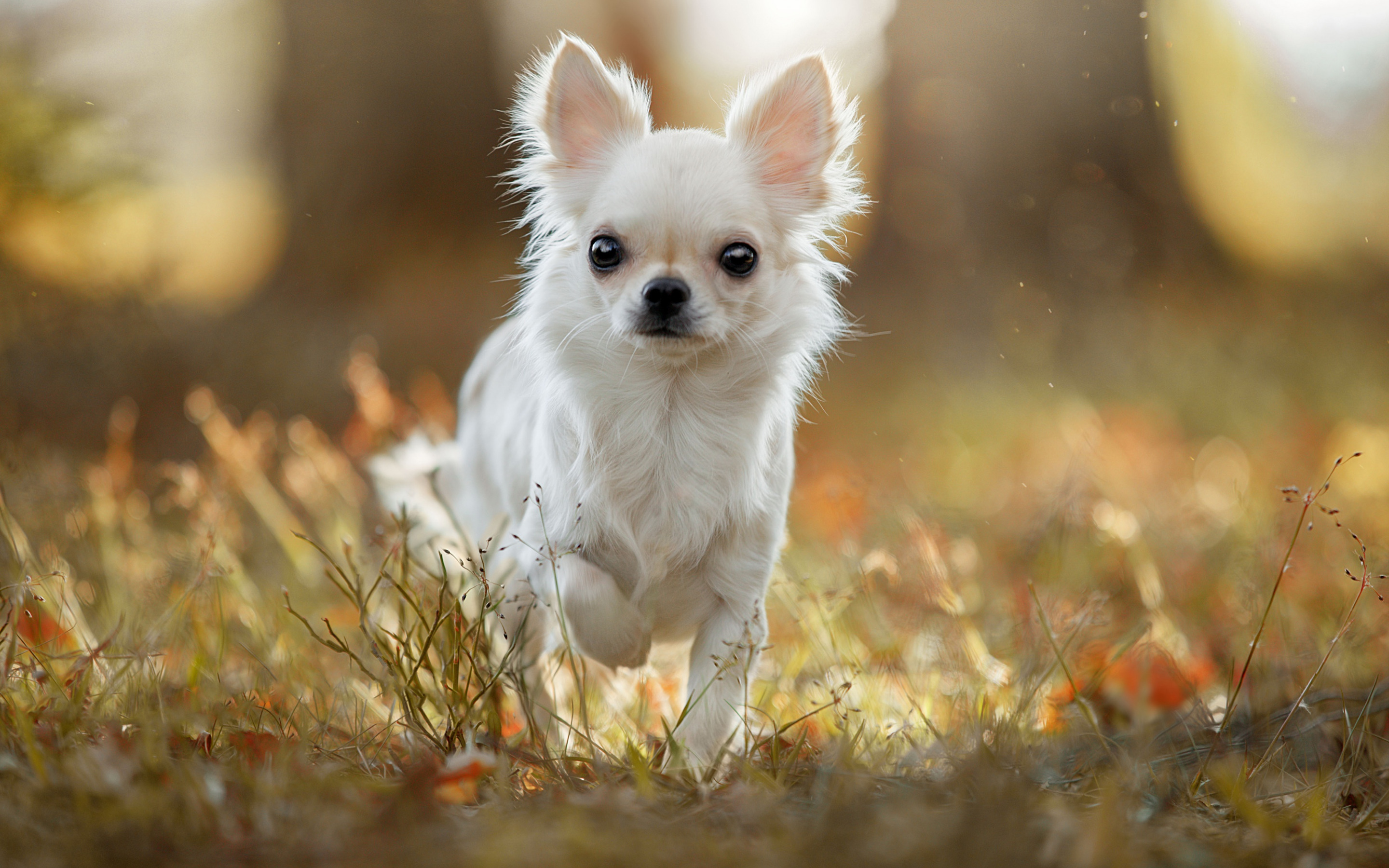 Description: A small white dog running through a field of grass and flowers in the fall time.
