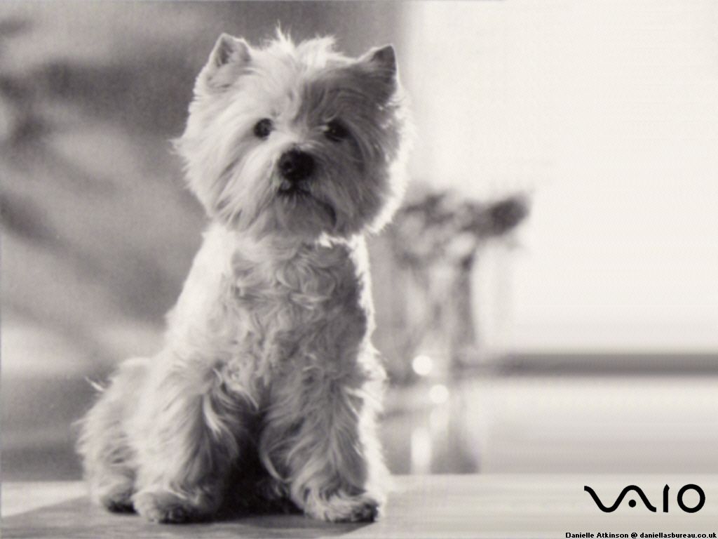 Description: A small white dog sitting on top of a wooden floor next to a vase of flowers and a glass.