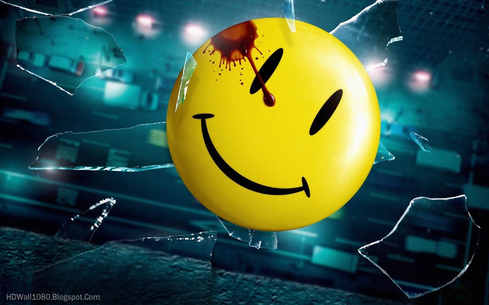 Description: A smiley face balloon with a knife sticking out of it's side and a broken glass window behind it.