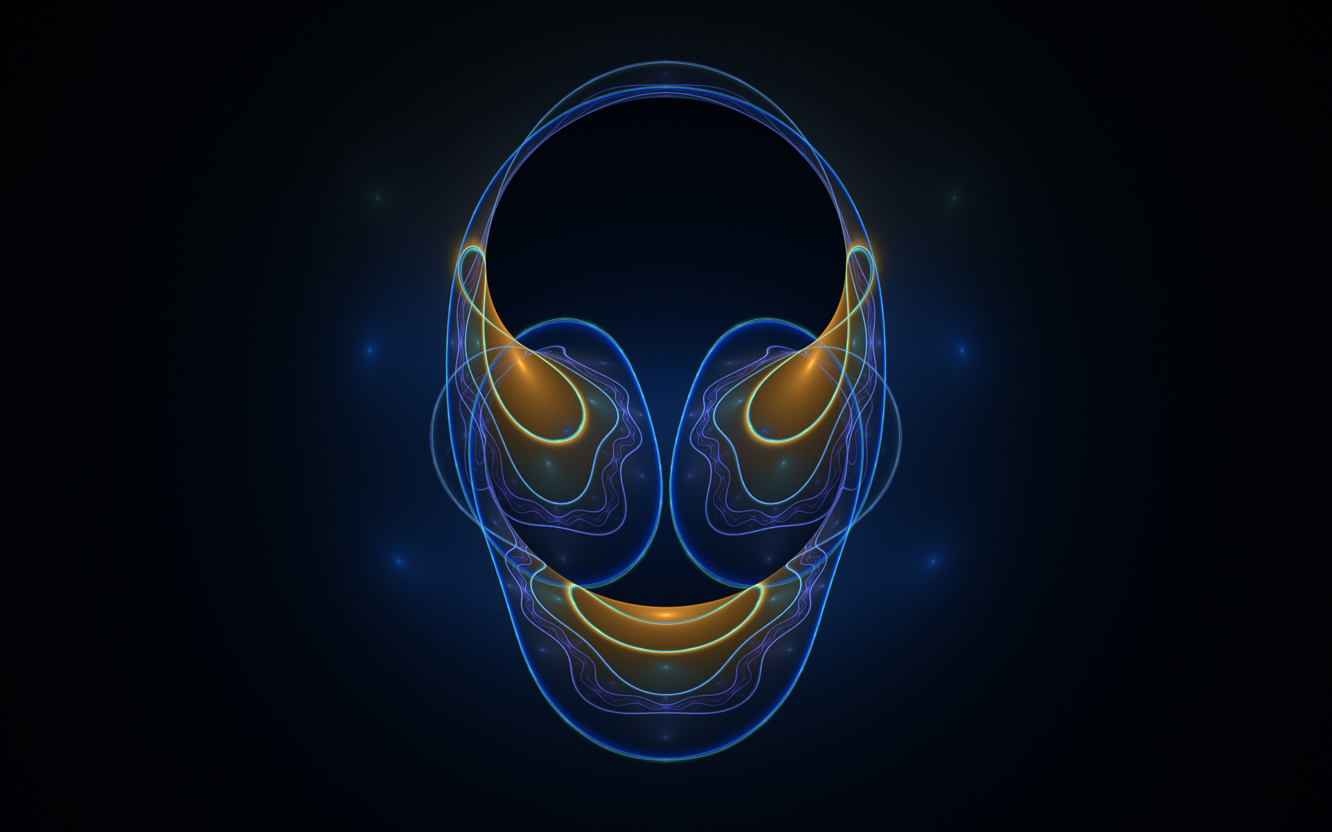 Description: A digital image of a smiling face with headphones on it's ears and a black background with a blue and yellow pattern.