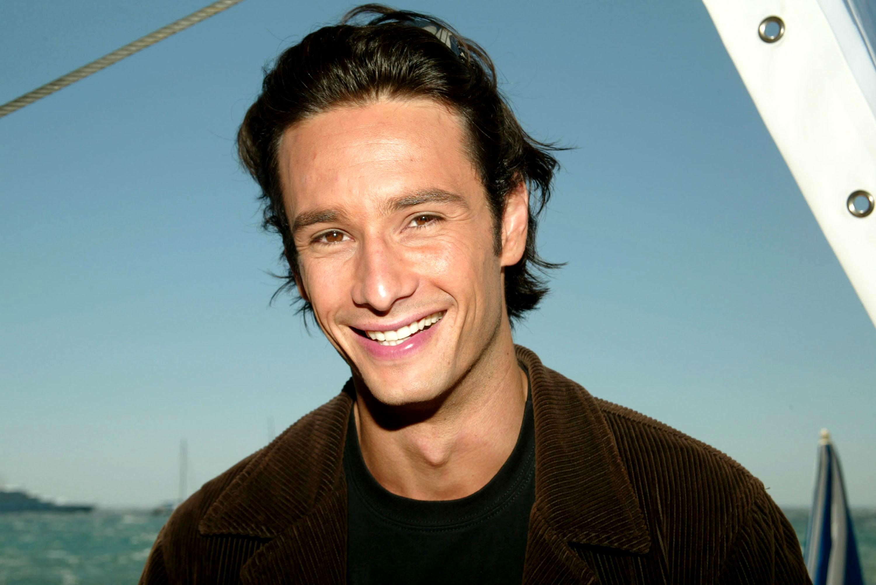 Description: A man smiling while standing on a boat in the ocean with a boat in the background and a blue sky.