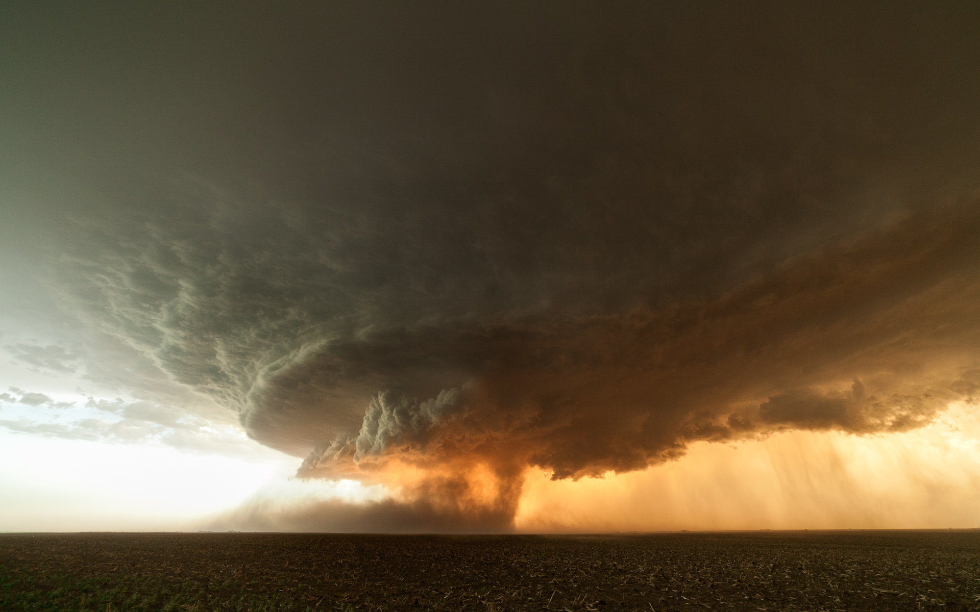 Description: A large cloud of smoke is seen in the sky over a field of grass and a field of crops.