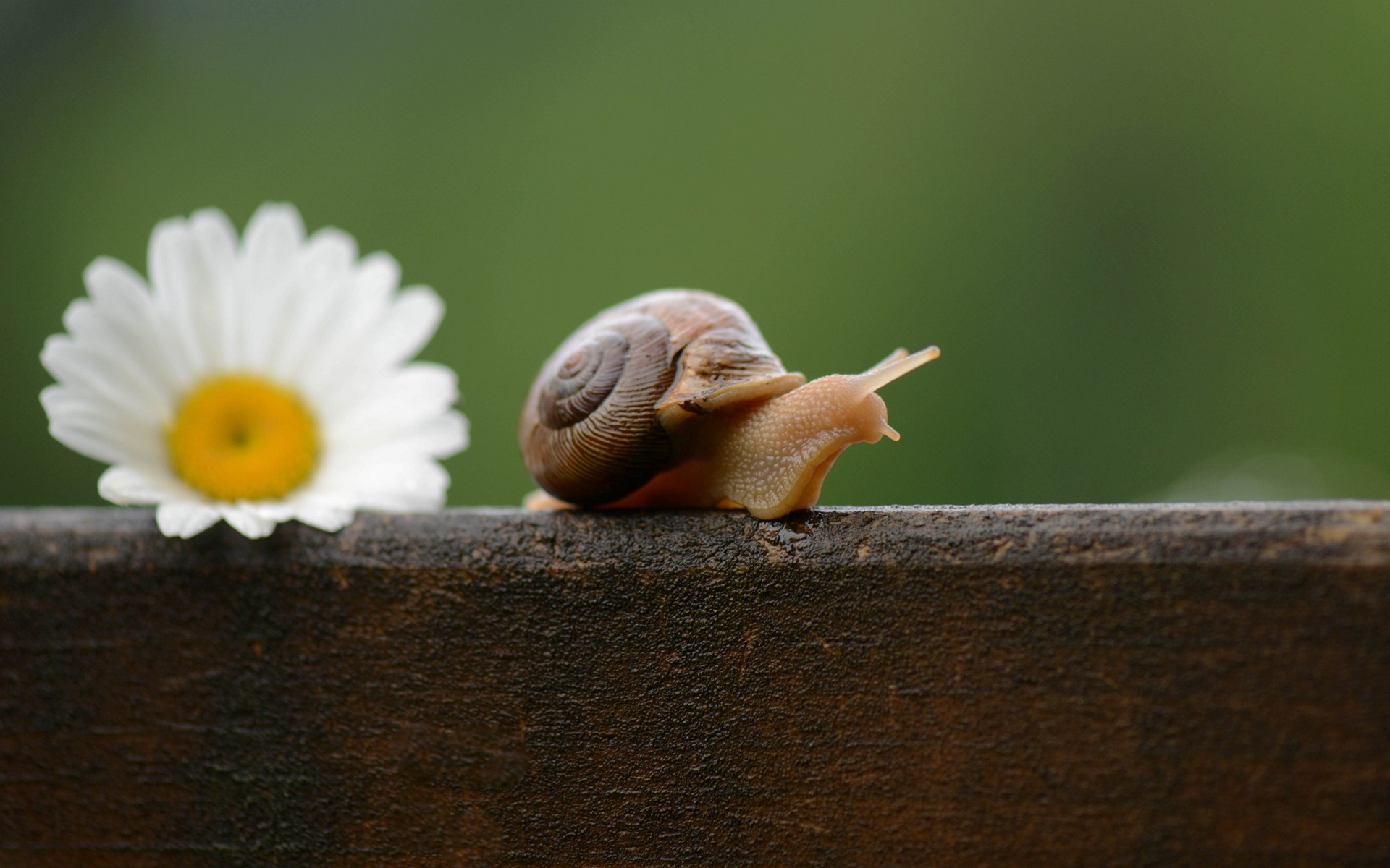Description: A snail is sitting on a wooden surface next to a flower that is on the ground and has a white flower in front of it.
