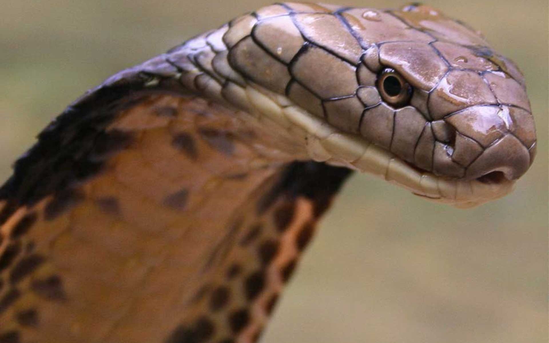 Description: A close up of a snake's head with a blurry background of grass and dirt in the background.