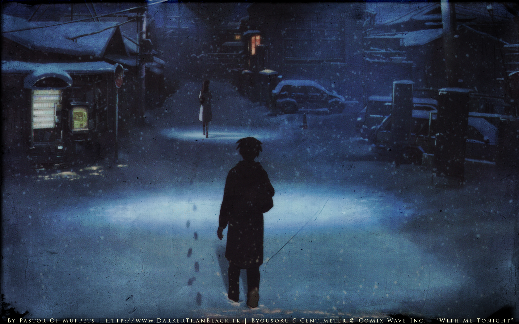 Description: A man standing in the snow in a dark alley at night with a street light in the background and a building with a clock on it.