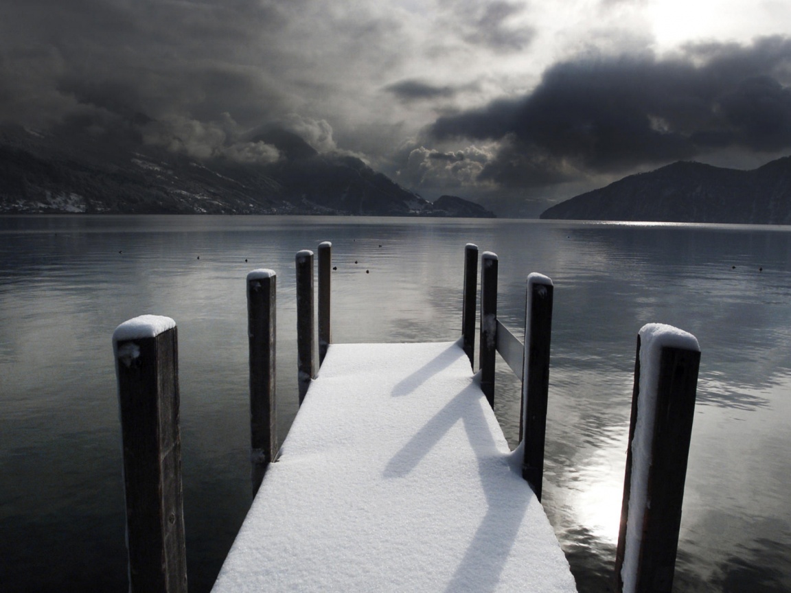 Description: A snow covered dock in a lake with mountains in the background and dark clouds in the sky above it.