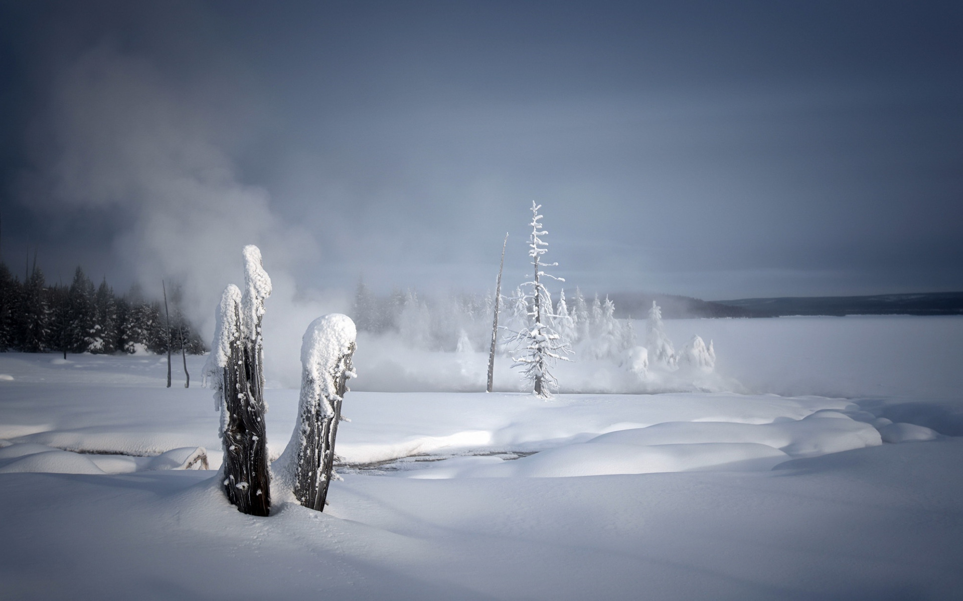 Description: A snow covered field with trees and a sky background with clouds in the distance and a few snow covered trees.