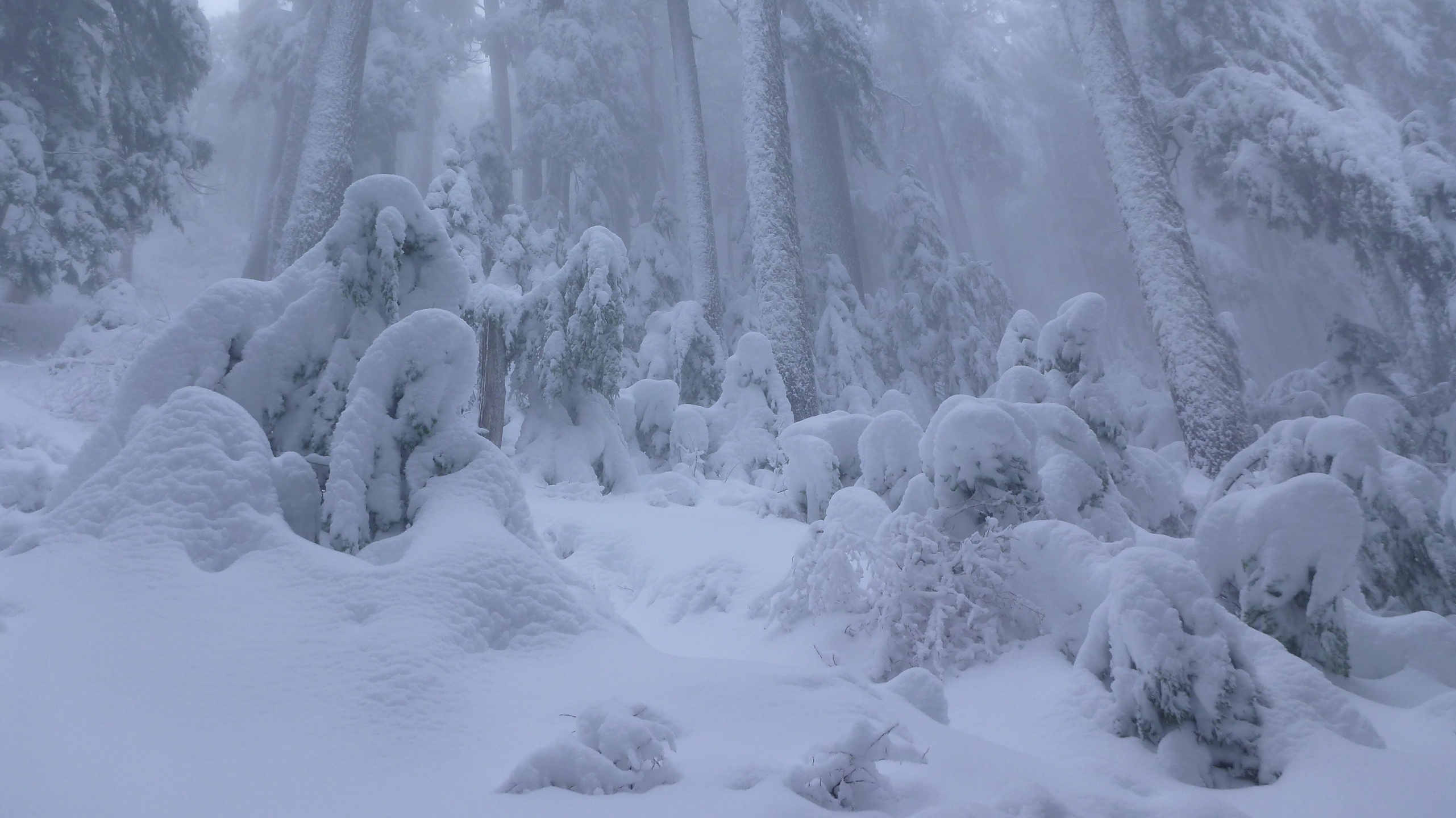 Description: A snow covered forest with lots of trees covered in snow and snow flakes on the ground and in the air.