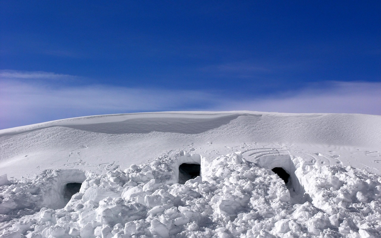 Description: A snow covered hill with a blue sky in the background and a few clouds in the sky above it.