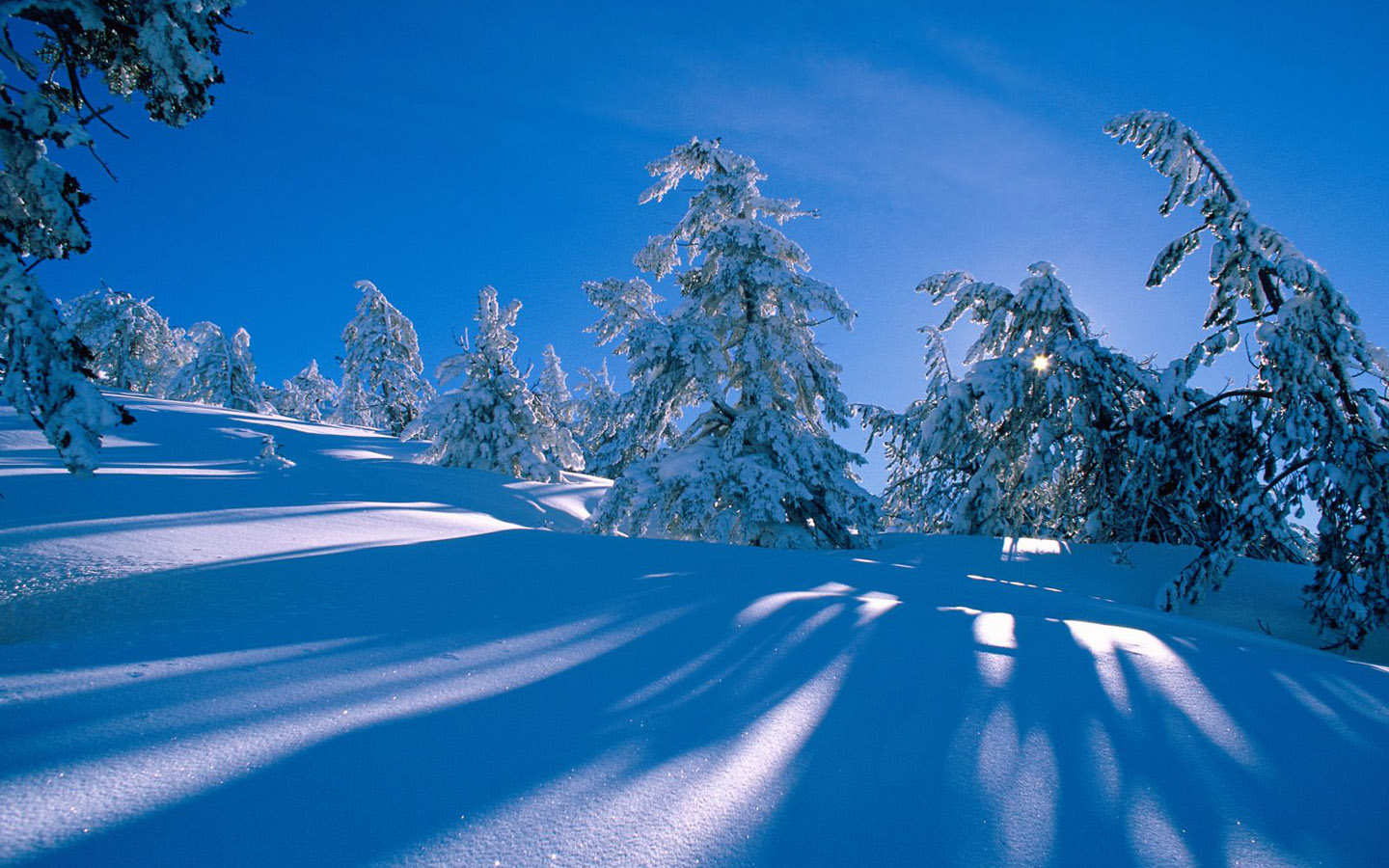Description: A snow covered hill with trees and a blue sky in the background with a few clouds in the sky.