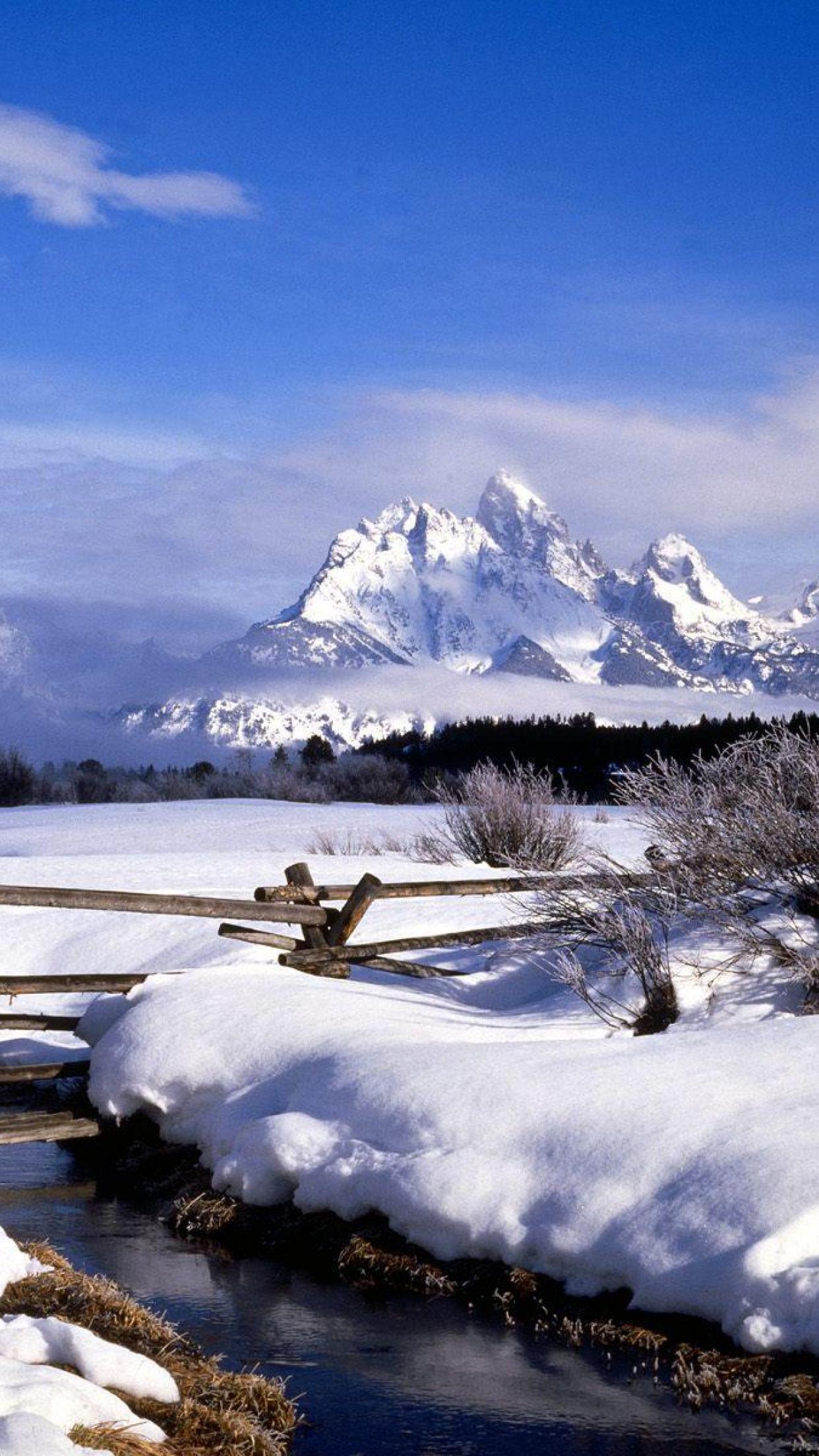 Description: A snow covered mountain range with a creek running through it and a wooden fence in the foreground with a stream running through it.